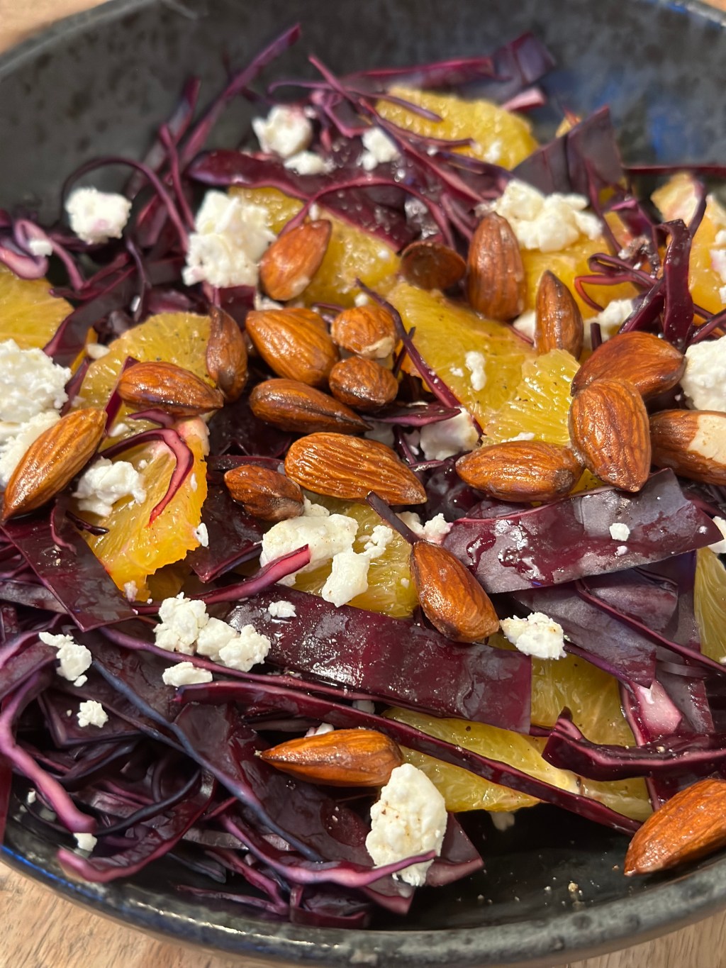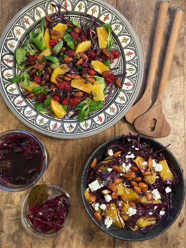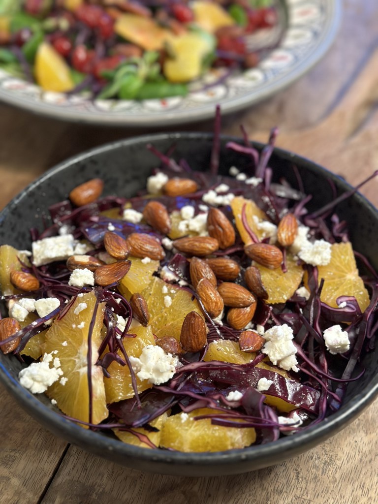 Siden år 2000 har mange haft en frisk rødkåls salat med på bordet juleaften. Det har typisk blot været frisk rødkål, appelsiner og mandler. Nogen bruger en eddike/olie dressing, andre involverer også appelsin. Jeg bruger æblecider, eddike, honning, olivenolie (1:1:1:1) og selvfølgelig salt og peber. Salaten har som et tvist fået feta ost, men er du ikke til det, kan du undlade dette.