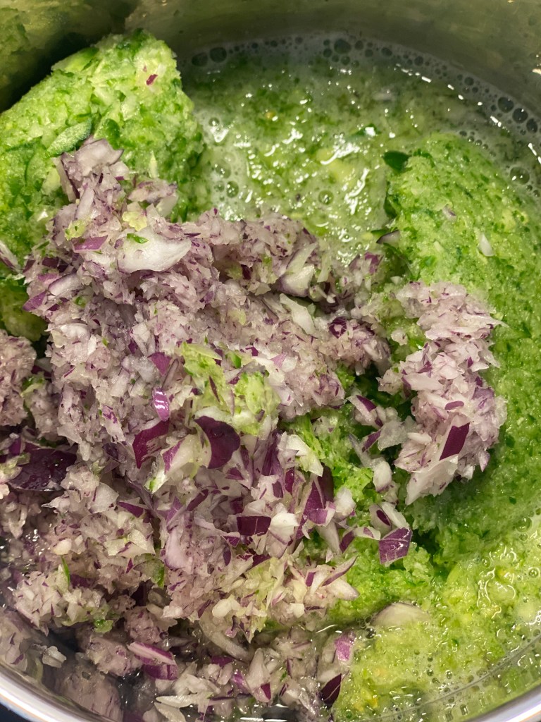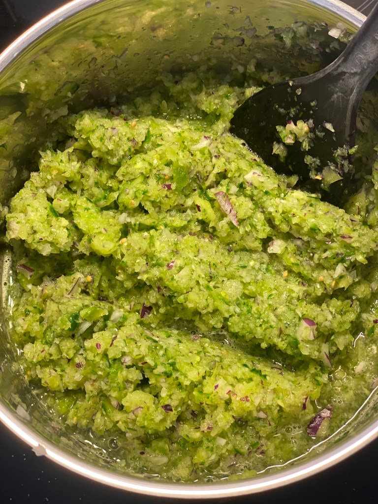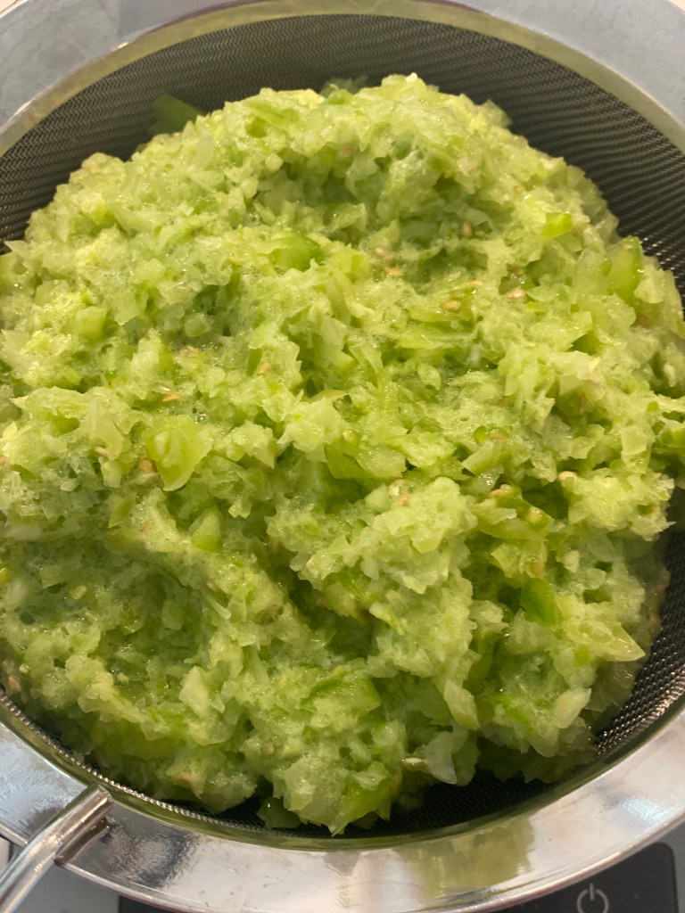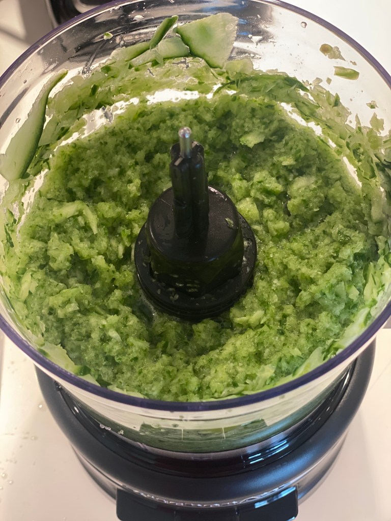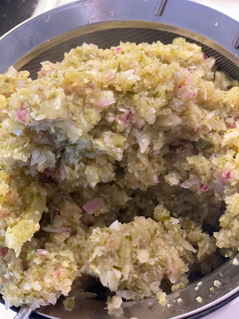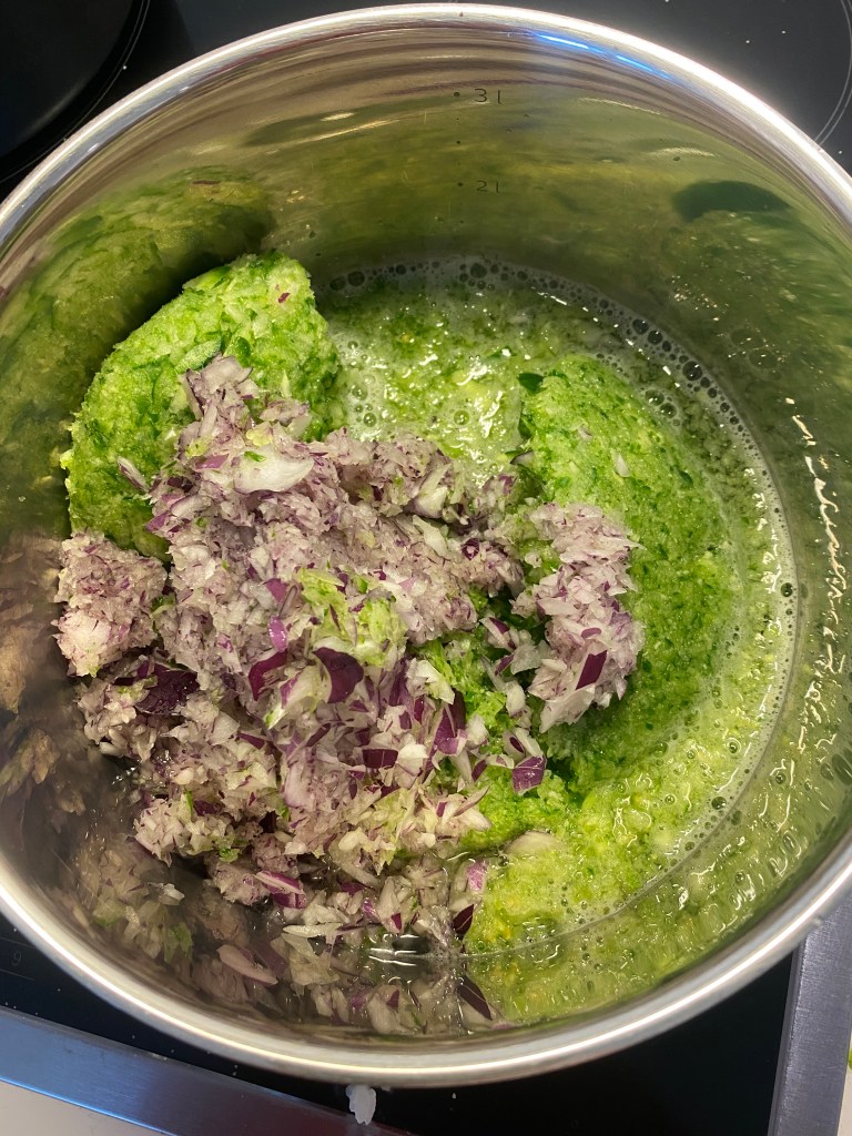 Hakkes efter smag i en foodprocesser, og står lidt med salten, så væsken frigøres. Si væsken fra og kog massen i ca. 20 minutter. Si resten af væsken fra.