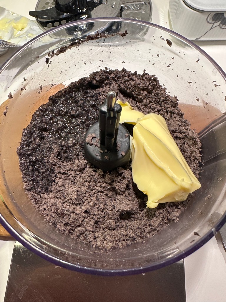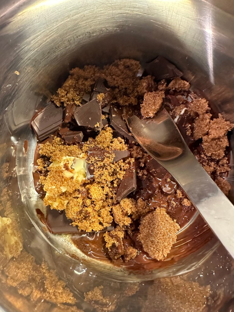 I en gryde smelter jeg chokoladen, 40 gram smør og brun farin. Den smeltede masse tilsættes i foodprocesser. Resten tilsættes, hvor æg kommer i en af gangen til sidst.