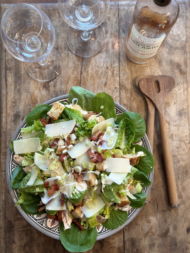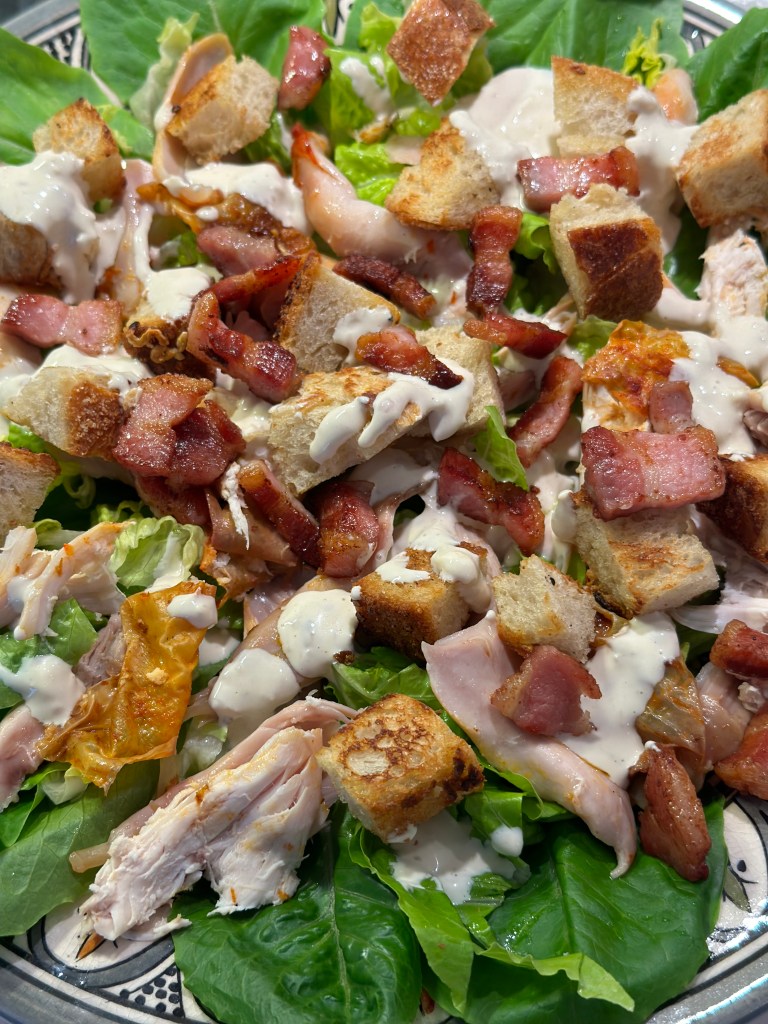 Den originale består af Olivenolien, æggeblomme, Worcestershire sauce, Pamasan, Hvidløg, Citronsaft, Sennep og peber. Og blot romain salat og croutoner. I den originale er der også Ansjoser i. Den originale har ikke kylling og bacon, men er efterhånden standard – også i min. Jeg bruger den Italienske bacon – Pancetta.