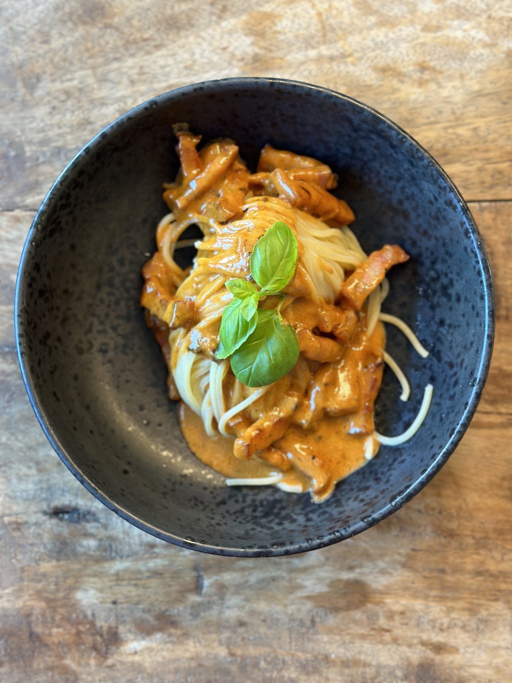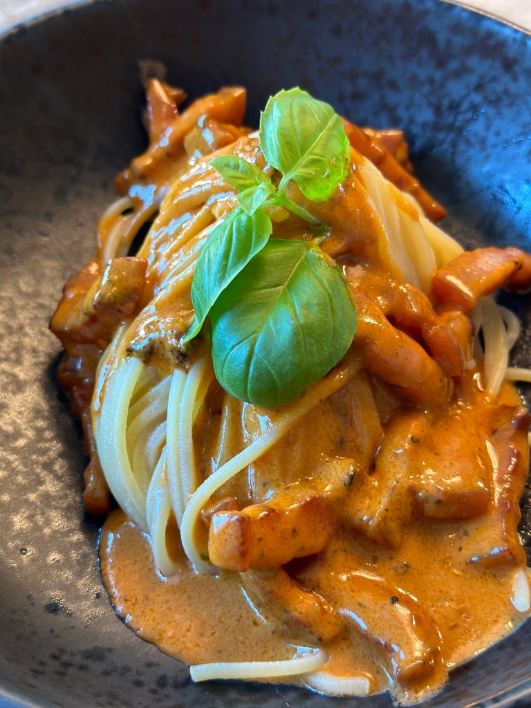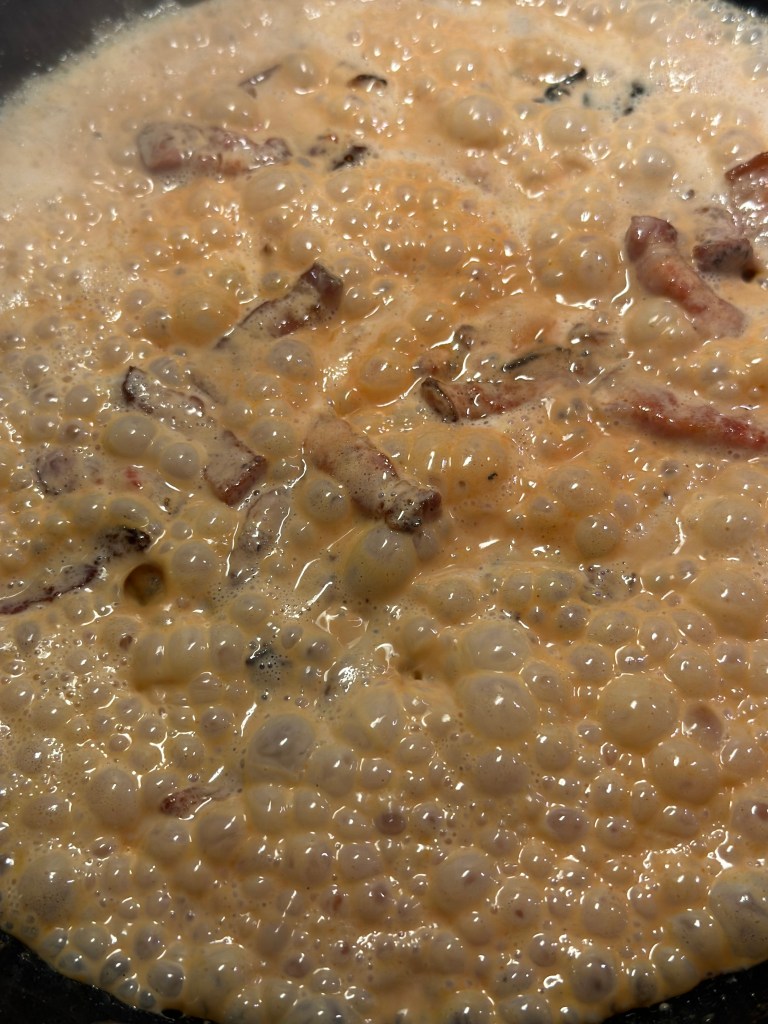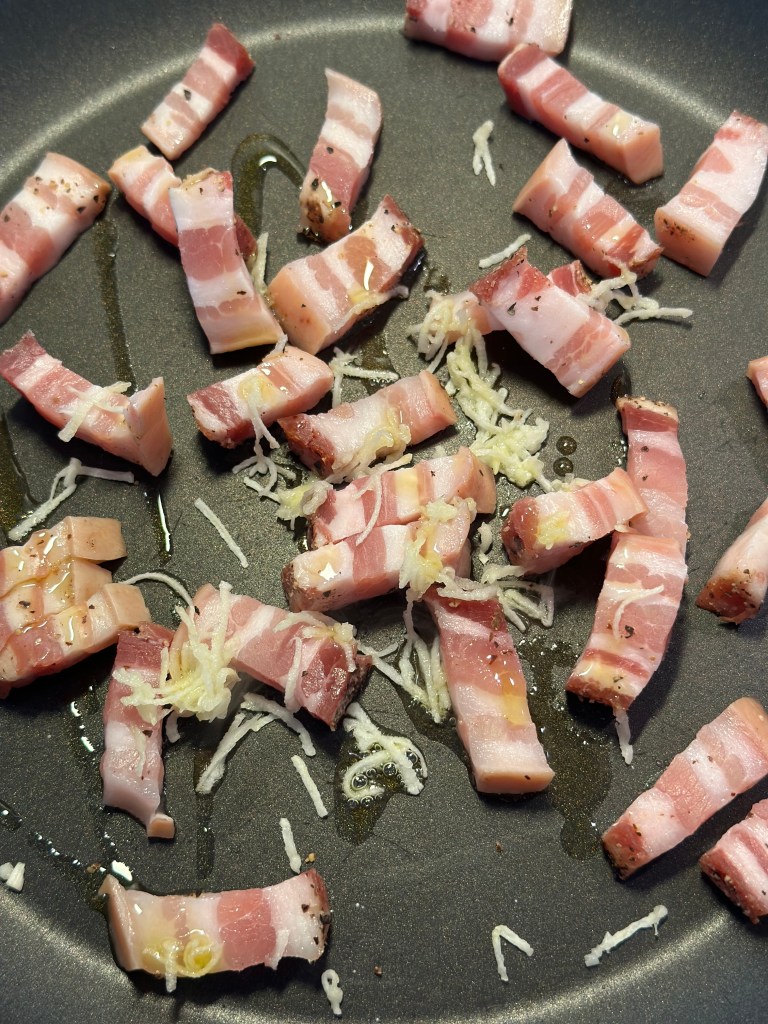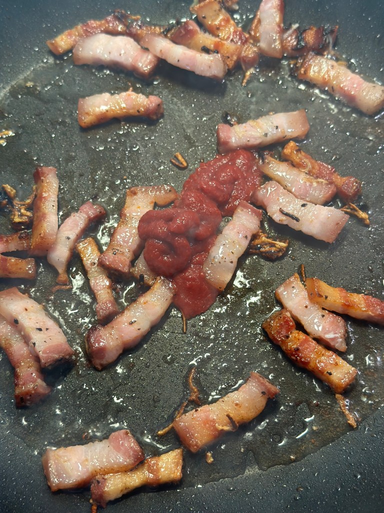 Pancetta er egentlig ikke en del af retten – og heller ikke tomatpure, jeg synes blot det tilfører noget ekstra – men tag det ud, hvis du vil lave den autentisk. Når jeg køber Pancetta, så vælger jeg altid det stykke med mindst fedt. Pancetta svitses på panden sammen med hvidløg. Allerede her tilsætter jeg tomatpure. Jeg tilsætter laktosefri fløde og Parmigiano Reggiano – smager til med lidt salt og en del peber – alternativt chili. Nogen gange vælger jeg spagetti, men oftest fettuccine. Jeg tilsætter ca. 1 dl pastavand til panden og når det er vokset ind i de øvrige ingredienser, tilsætter jeg pastaen. Vender det indtil melet i pastaen har gjort sovsen cremet. Serverer med lidt friskrevet Parmigiano Reggiano og frisk basilikum.