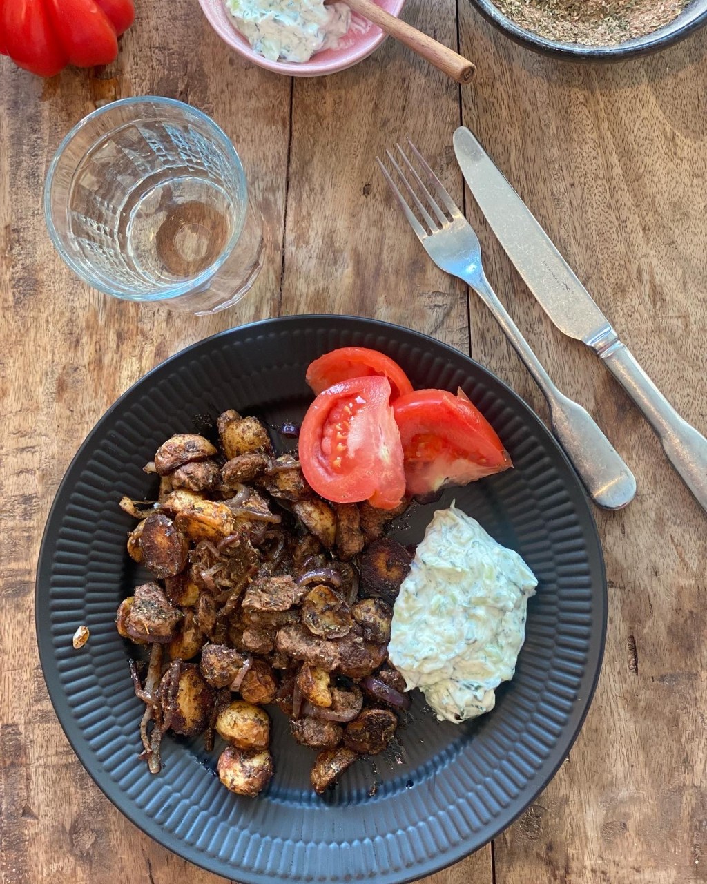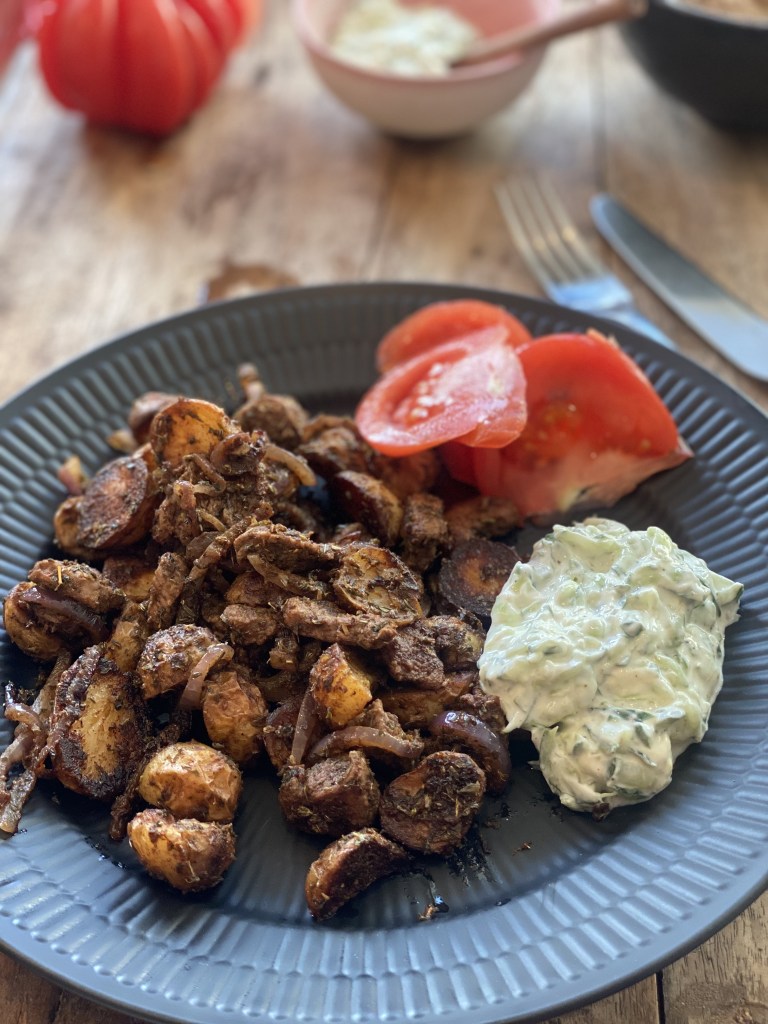 Serveres med tomater og Tzatziki.