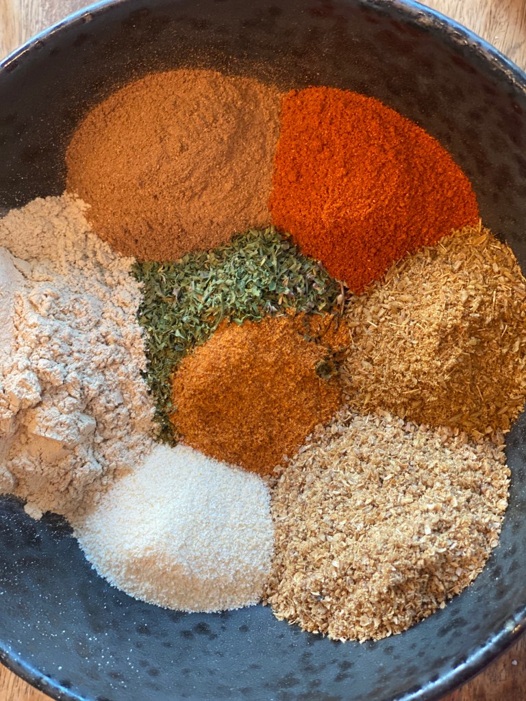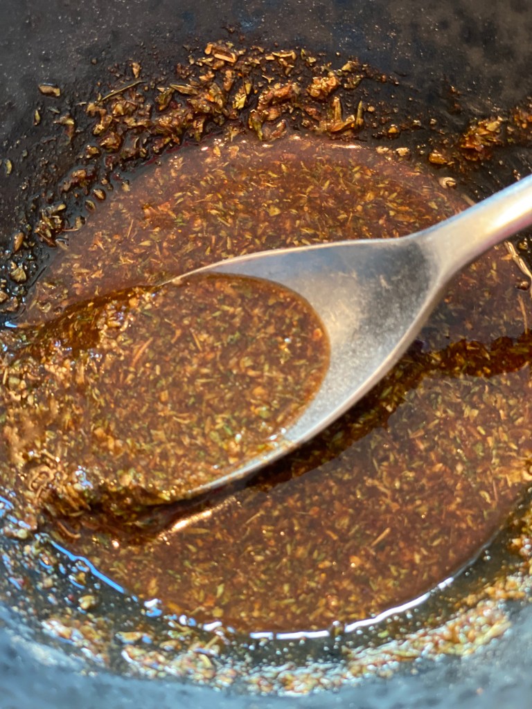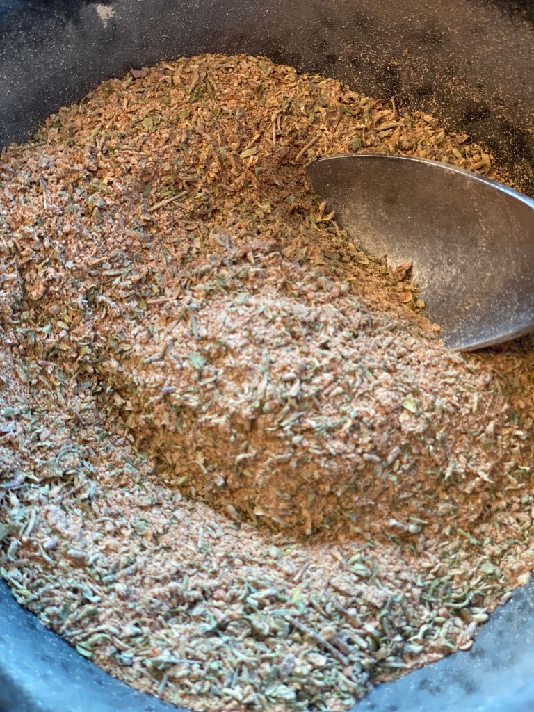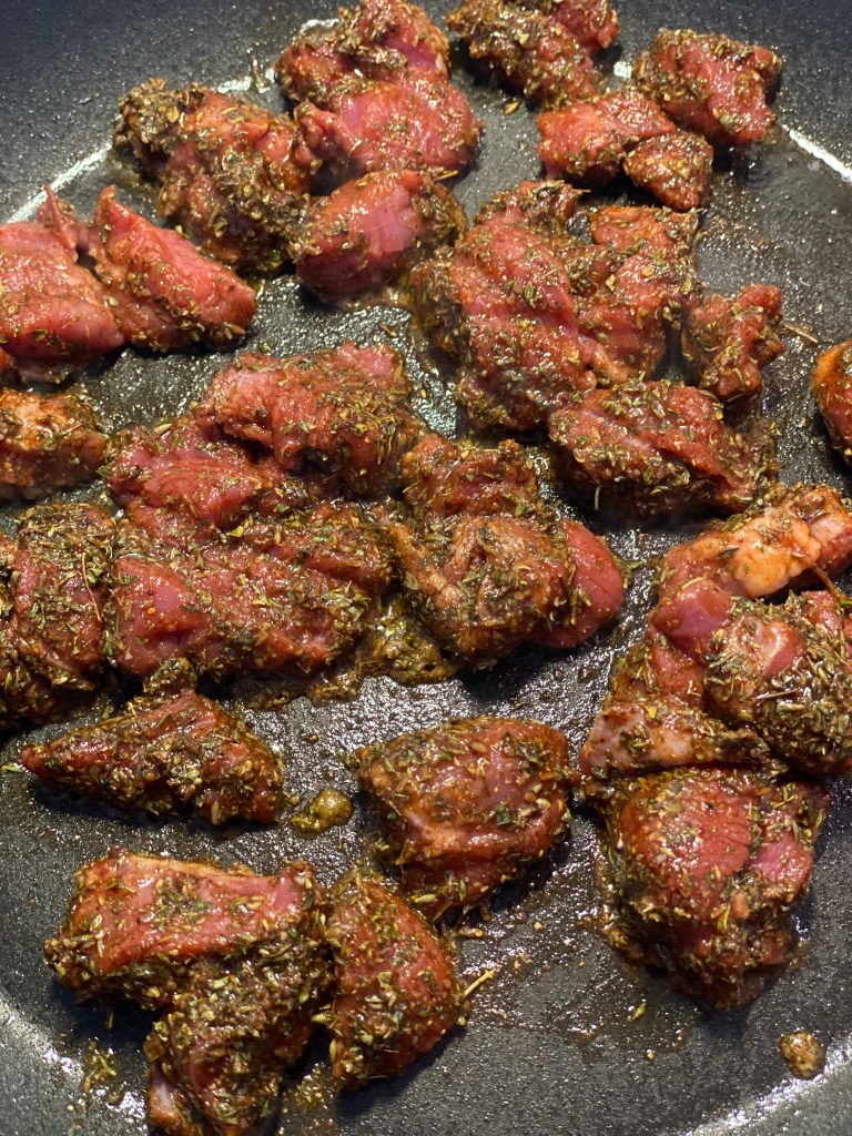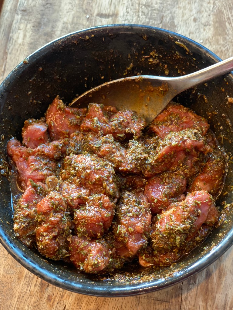 Jeg bruger min GYROS KRYDDERI og tilsætter olivenolie, og dermed har jeg en fin og velsmagende marinade. Jeg vender lammet i, og lader det trække på køl i en times tid, men gerne natten over.