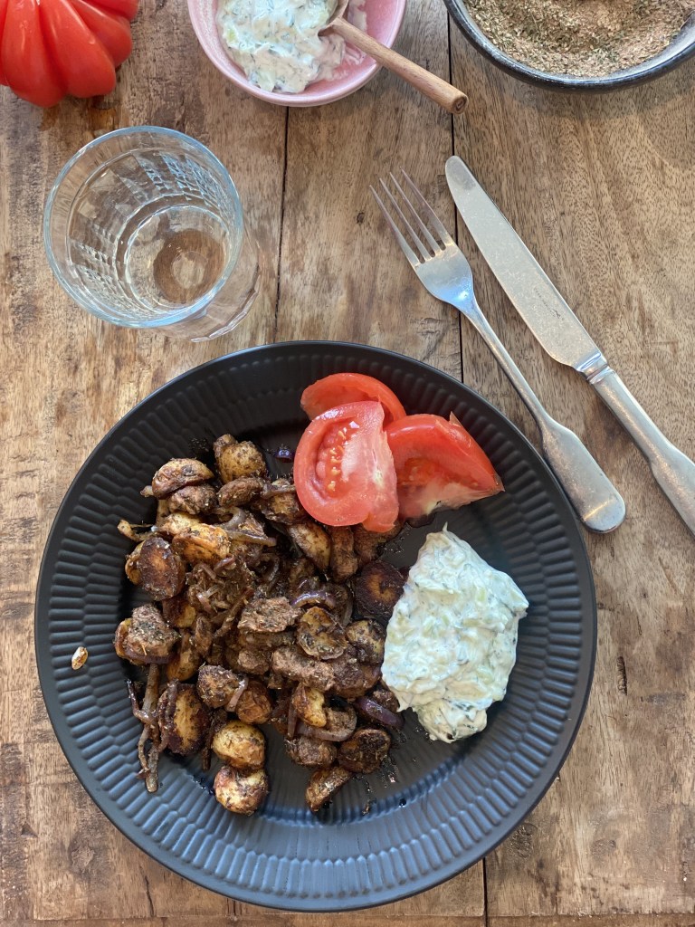 Jeg vendte lammet på panden sammen med et rødløg og ovnbagte kartofler fra i går. Det skal blot have få minutter.