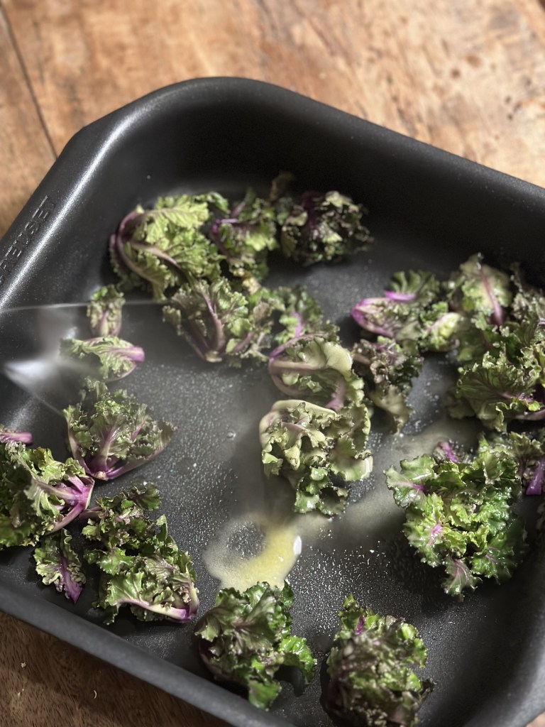 Skyl dem godt, og tør dem i et viskestykke. Spray med hvidløgs olienolie, og sæt i ovnen i 25 minutter i en varmluftovn ved 180 grader.