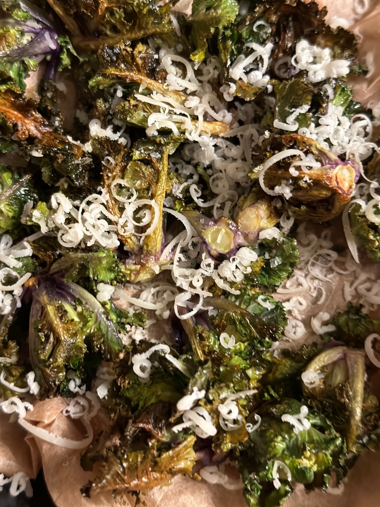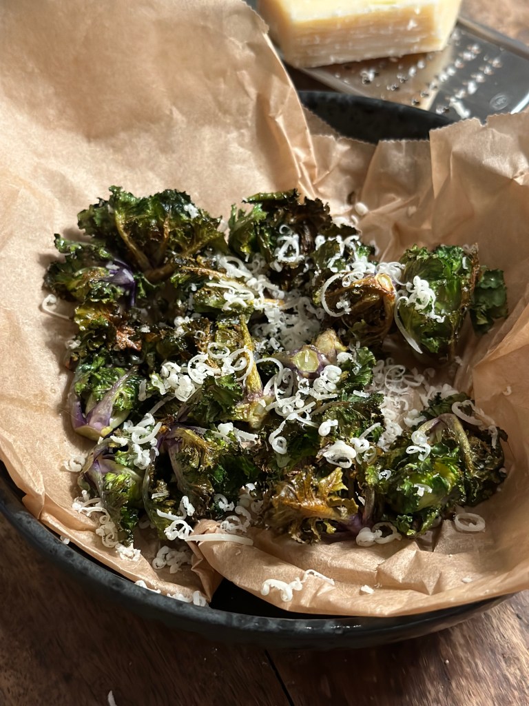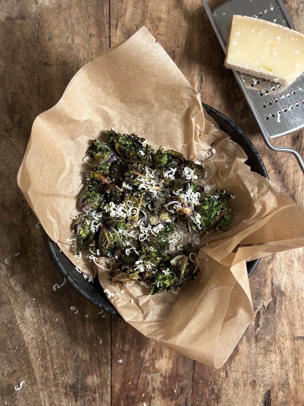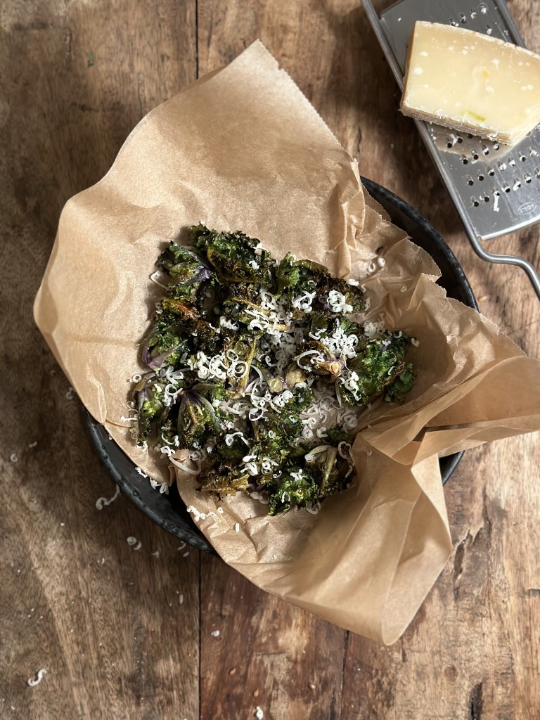 Når de er sprøde, så tag dem ud og riv parmesan ost over.