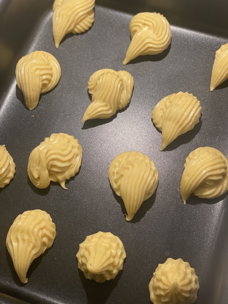 Jeg kommer min dej i en sprøjtepose, så er den nemmere at arbejde med. Sæt i ovnen ved 200 grader i ca. 20 minutter – tjek dem gennem glasruden efter 15 minutter – skal være gyldne.