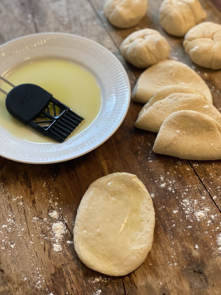 Dejen æltes godt sammen, og sættes i hævning i ca. 30 minutter. Herefter deles den op i 8 lige store størrelser, til runde boller. Hver bolle rulles og smøres med olie, hvorefter den foldes. Efterhæves i 15-30 minutter.