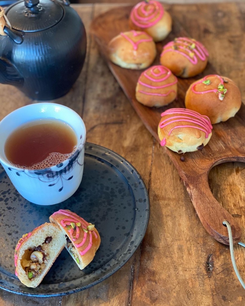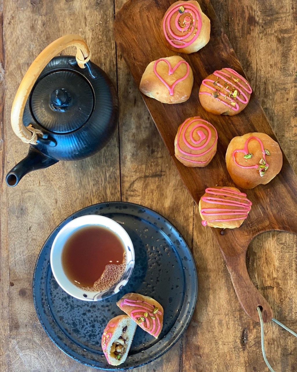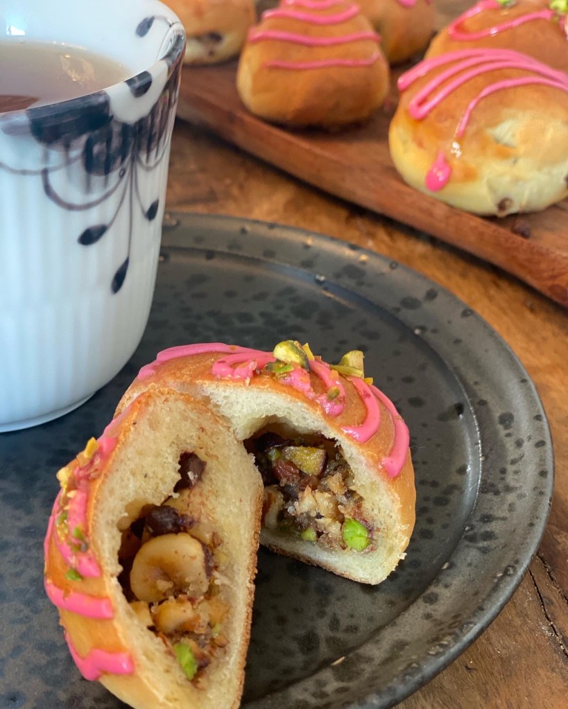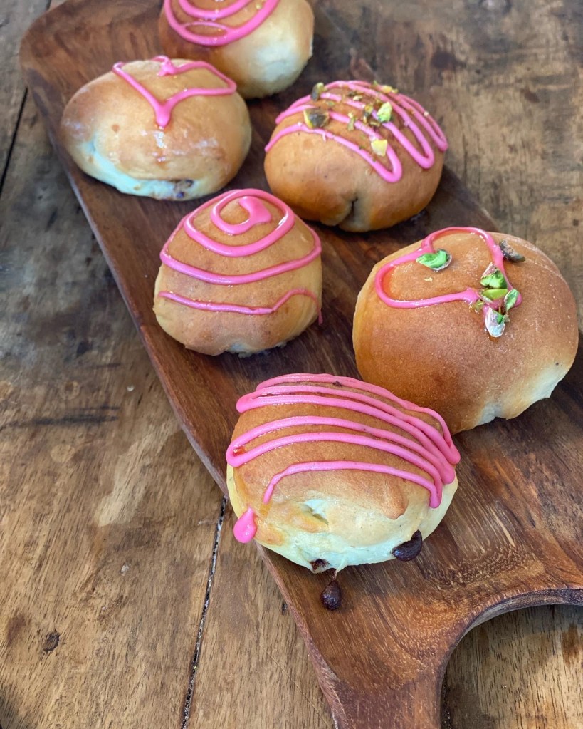 Glasur laves af hindbær sirup/saft og flormelis – evt. tilsæt lidt rød farve. Monteres i en sprøjtepose, og pynt bollerne når de er afkølet.