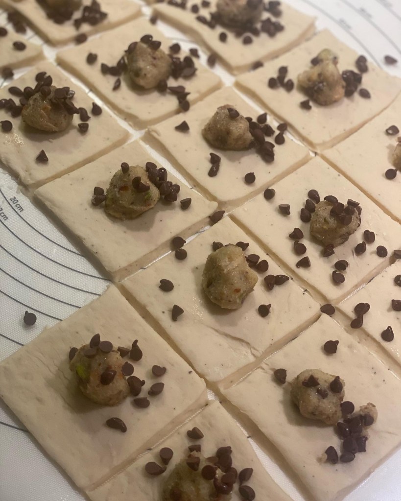 En klat remonce placeres i midten af hver firkant. Der foldes hjørne mod hjørne, vendes og rulles til en rund bolle.