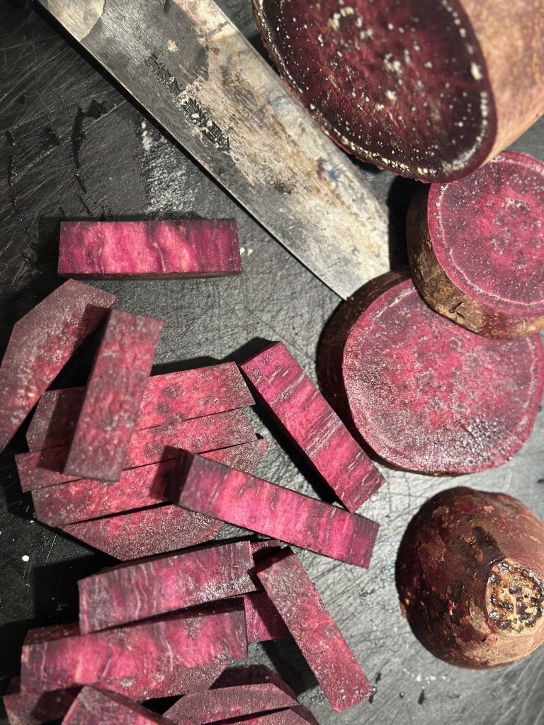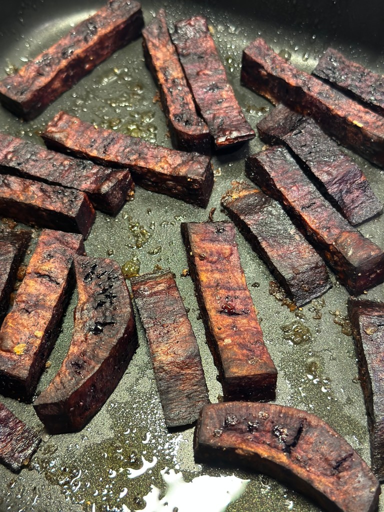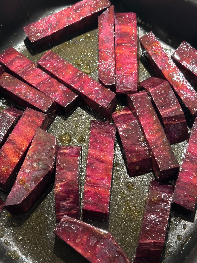 Jeg har i dag lavet min kartoffel til grovfritter. Skåret dem i rimelig store stykker, blot tilsat salt og peber og vendt den i rapsolie. De skal ca. have 25 minutter ved 200 grader. Flagesalt på toppen