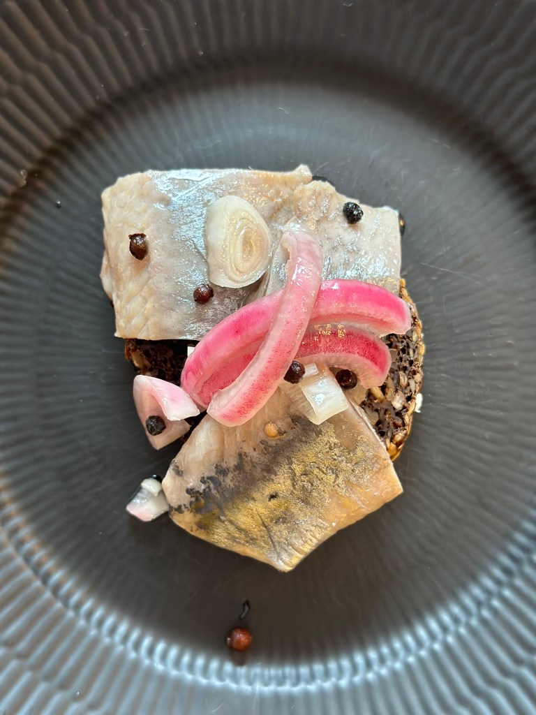 Jeg skærer sildefiletterne i mundrette størrelser, og tilsætter 2 rødløg som er skæret i strimler. I ovenstående lage, er der til 12 silde filetter (6 sild).