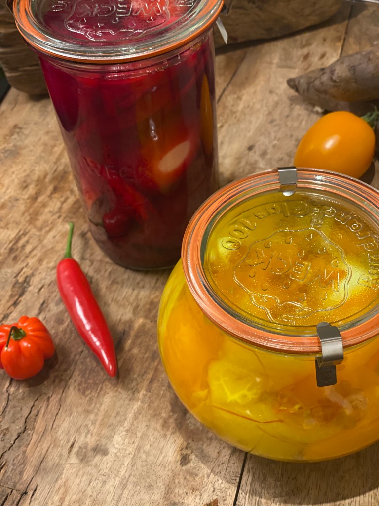 De røde blev flottest, de gule smagte bedst. Resterne satte jeg på køl, og legede lidt videre idag.