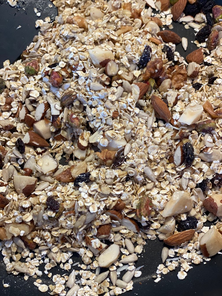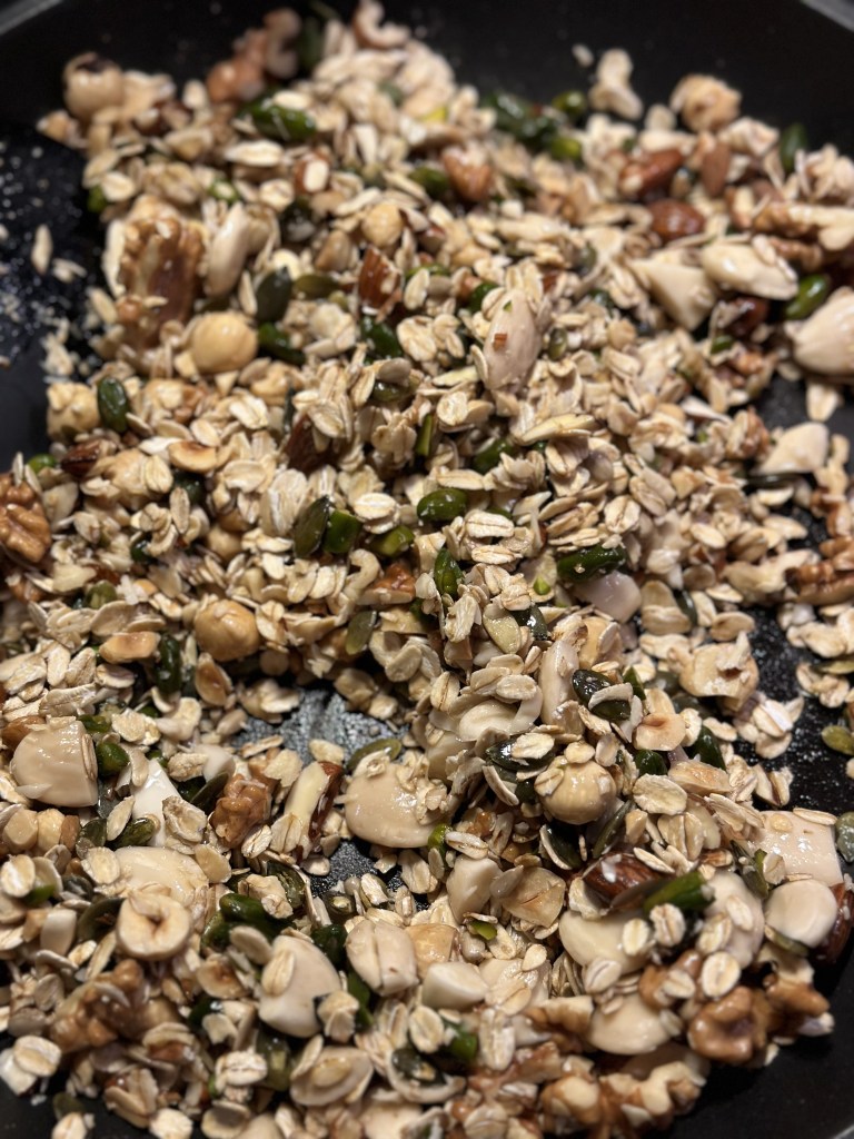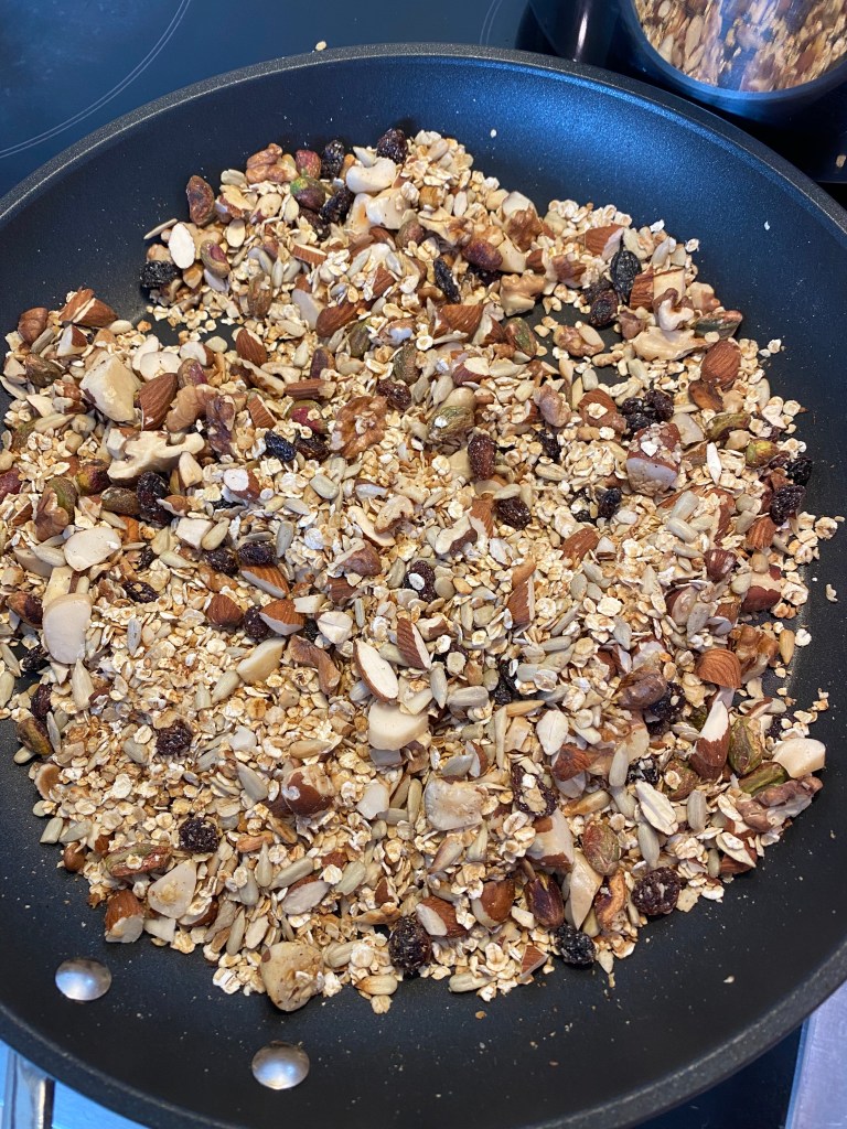 Jeg hakker alle nødder og rister den altid i lidt smør eller olie, hvorfor jeg nok fremover burde kalde den Dyrvig’s Granola.