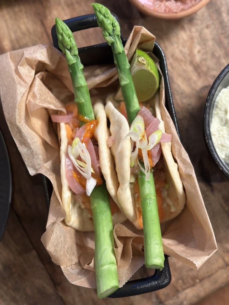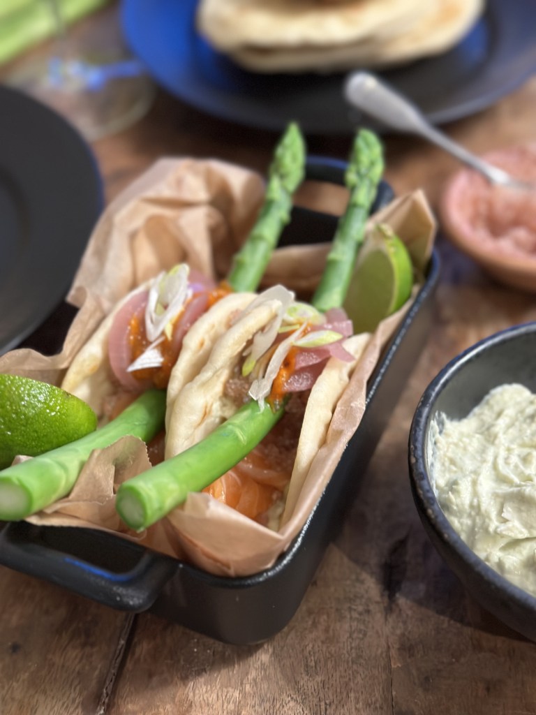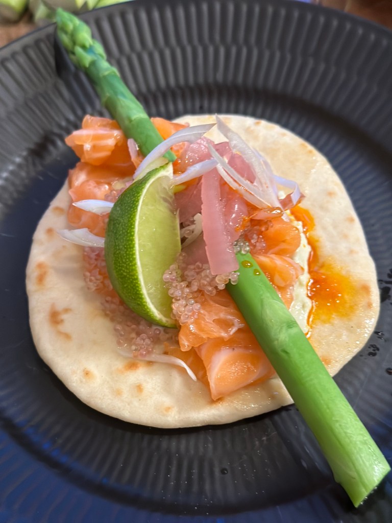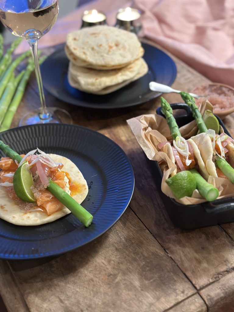 Fladbrødet laves i taco størrelse. I bunden smører jeg Avocado creme, som blot er avocado, græsk yoghurt, lime, hvidløg og salt (som blendes). Laks royal ovenpå, dernæst dampet asparges, rødløg, forårsløg og en sjat chilisauce.