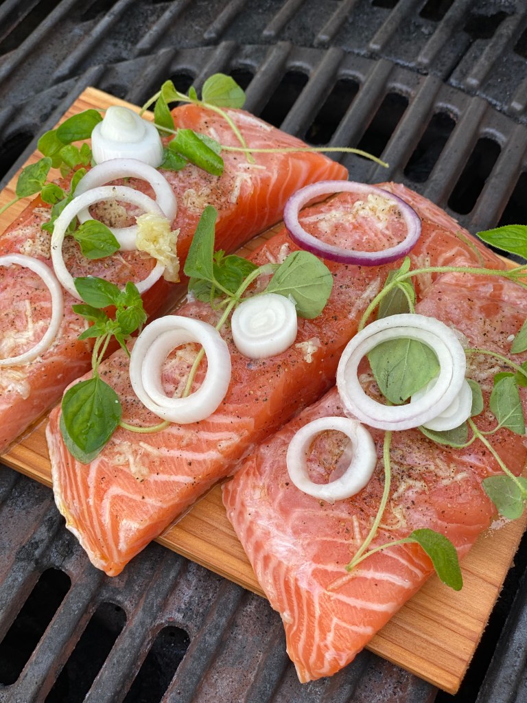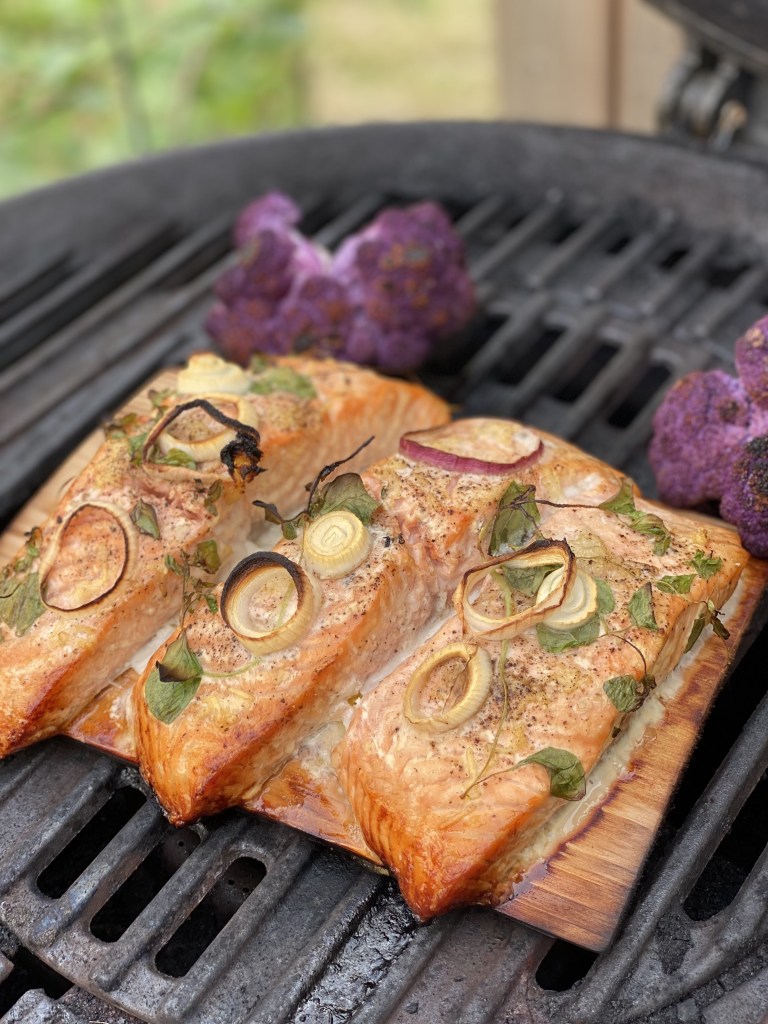 Indirekte varme på grillen, til laksen begynder at blive løs. Der er lidt forskel på hvordan man vil have sin laks, min må godt være let rå i den absolutte kerne.