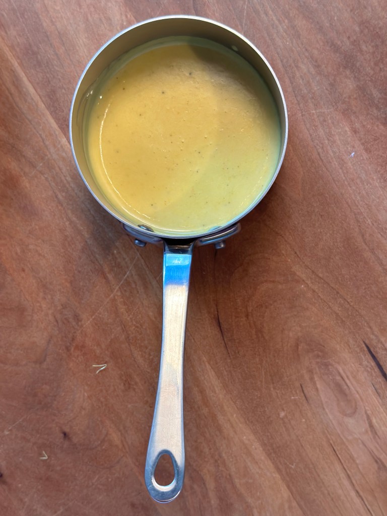 Smelt smørret i en kasserolle ved svag varme. Tilsæt mel, og pisk det godt sammen. Jeg bruger et rundt piskeris, som jeg i sin tid lærte at bruge af min mor, så jeg undgik at sovsen brændte på og jeg kom rundt i alle hjørner. Tilsæt fond – gerne varm, og tilsæt lidt af gangen, således den får den konsistens som du ønsker. Ovenstående er blot vejledende – måske du kan lide den tykkere eller tyndere. Når sovsen har den ønskede konsistens, tilsætter du fløden – den gør hverken sovsen tyndere eller tykkere. Sovsen er nu klar til du smager den til. Og her kan du næsten gøre hvad du føler for, men huske smage hjulet – at en fed sovs skal også have syrer, men da denne ikke er special “fed”, er citronen rigelig. Sovs kan sagtens blive lidt bitter, hvorfor sødme er vigtigt. I denne kan det være honning, men står ikke i opskriften. Endelig kan du sørge for umami, og her kan du tilsætte lidt revet parmesan (hvilket heller ikke er i opskriften). Smag til med muskatnød, salt og peber – gurkemeje er blot for saucen bliver mere “citron-gul”.