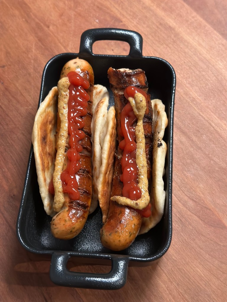 Jeg har rykket lidt på termerne, taget nogle af kulhydraterne ud, ved at bringe et fladbrød ind i stedet. Taget en lægge kylling pølse med tomat og ramsløg. Beholdt ketchup og sennep, men tilført en salsa på bøftomat, løg og mango – og så et par hjemmeristede løg på toppen.