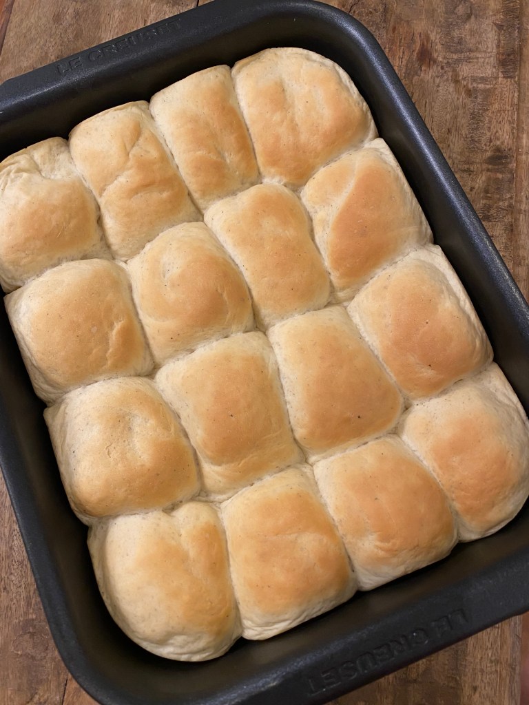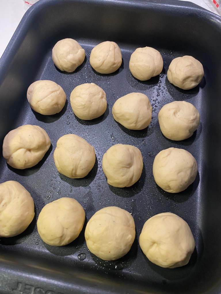 Jeg hæver ikke to gange (skulle måske), men deler i 16 boller med det samme og lægger i en smurt form – god plads i mellem, for de hæver for vildt på blot halvanden time.