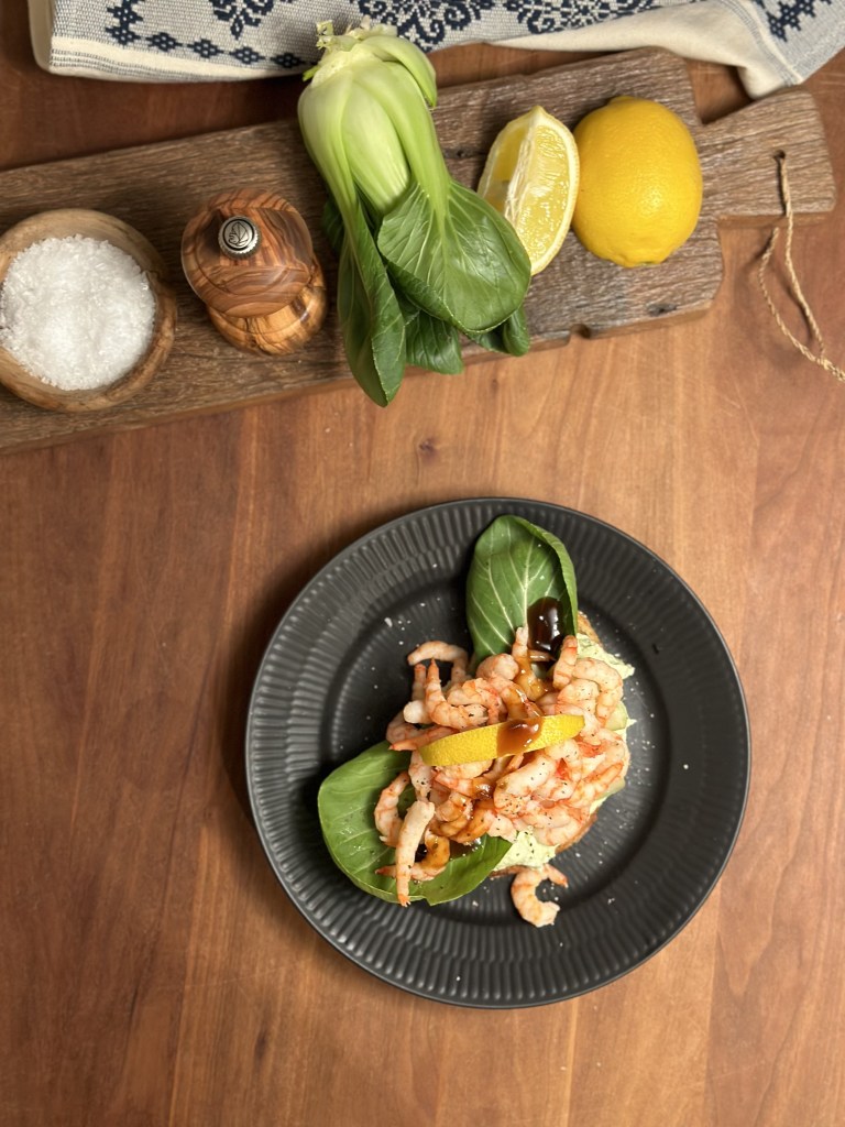 Rigeligt med håndpillede koldtvandsrejer og en citron og lidt peber på toppen. Jeg monterer med et par pak choi blade, og et par dråber teriyaki på toppen.