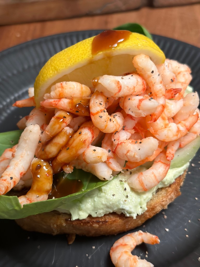 Jeg har her lavet en rejemad med ristet ølandsbrød. Så har jeg lavet en avocado smørost som består af:
