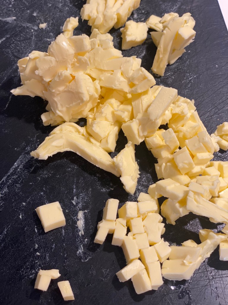 Bland først de tørre dele. Herefter smør terningerne og endelig saml dejen med koldskålen.