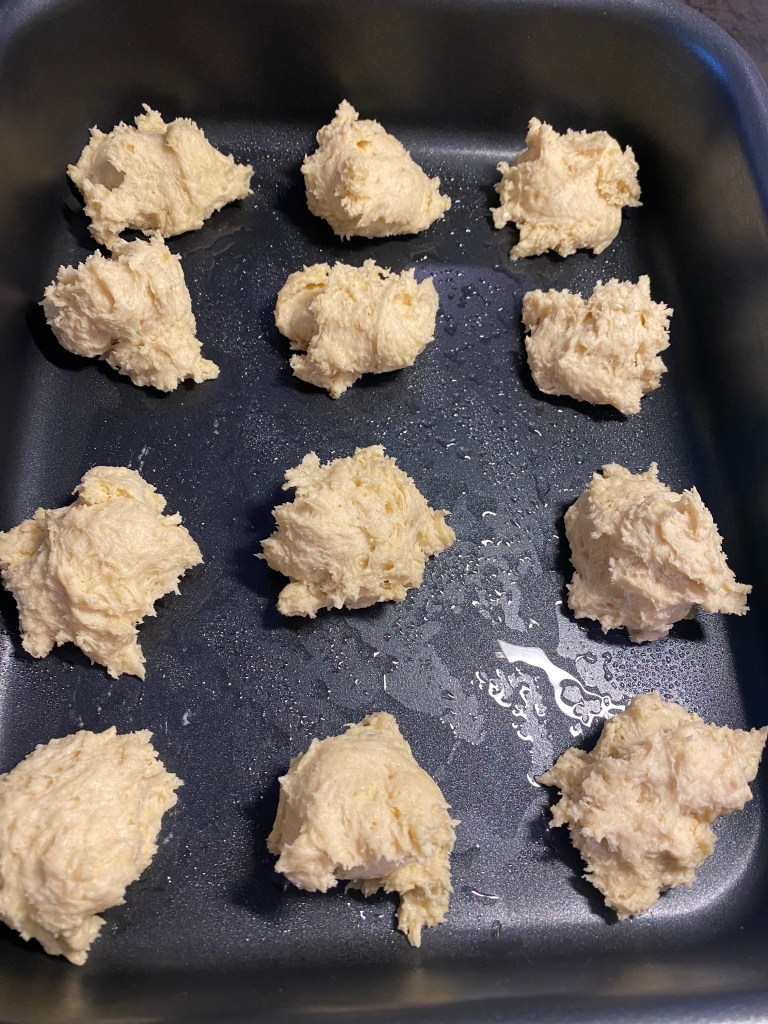 Dejen placeres på en bradepande i “klatter” og sættes i ovnen ved 180 grader i ca. 12-14 minutter – alt efter ovn.