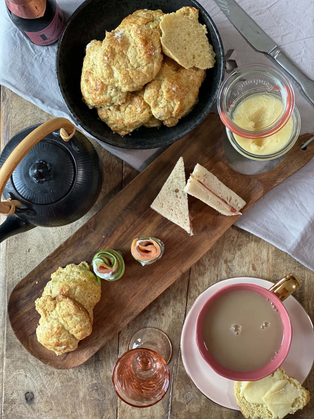 Scones serveres selvfølgelig med hjemmelavet Lemon Curd , clotted cream (en slags opvarmet flødeskum) eller marmelade.