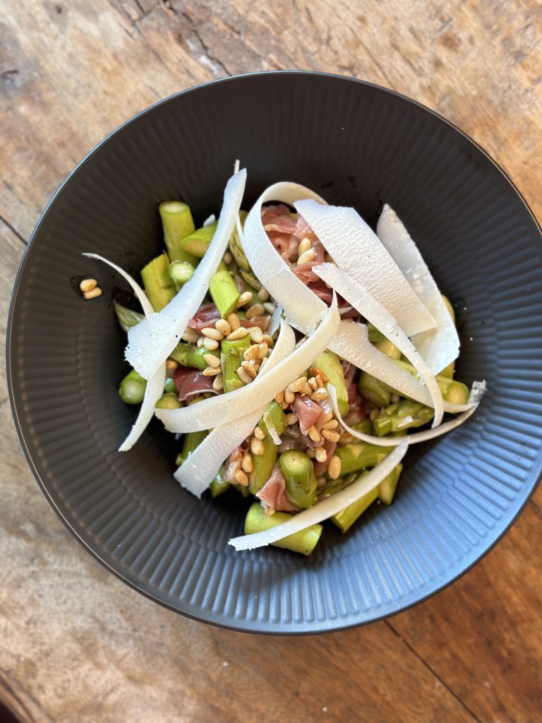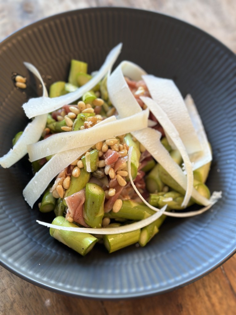 Skær asparges i mundrette stykker. Opdel Parmaskinken i mindre stykker. Rist pinjekernerne. Mis det hele med dressingen, og top med revet parmesan.