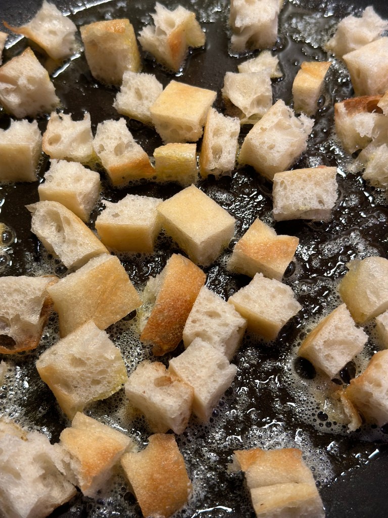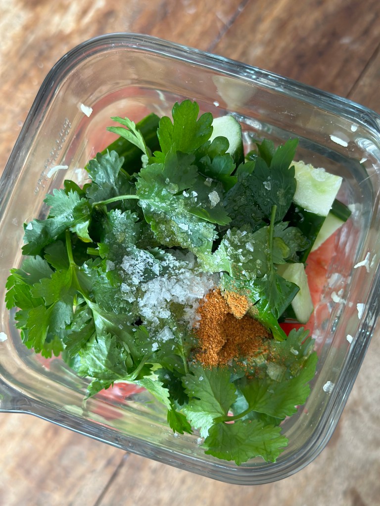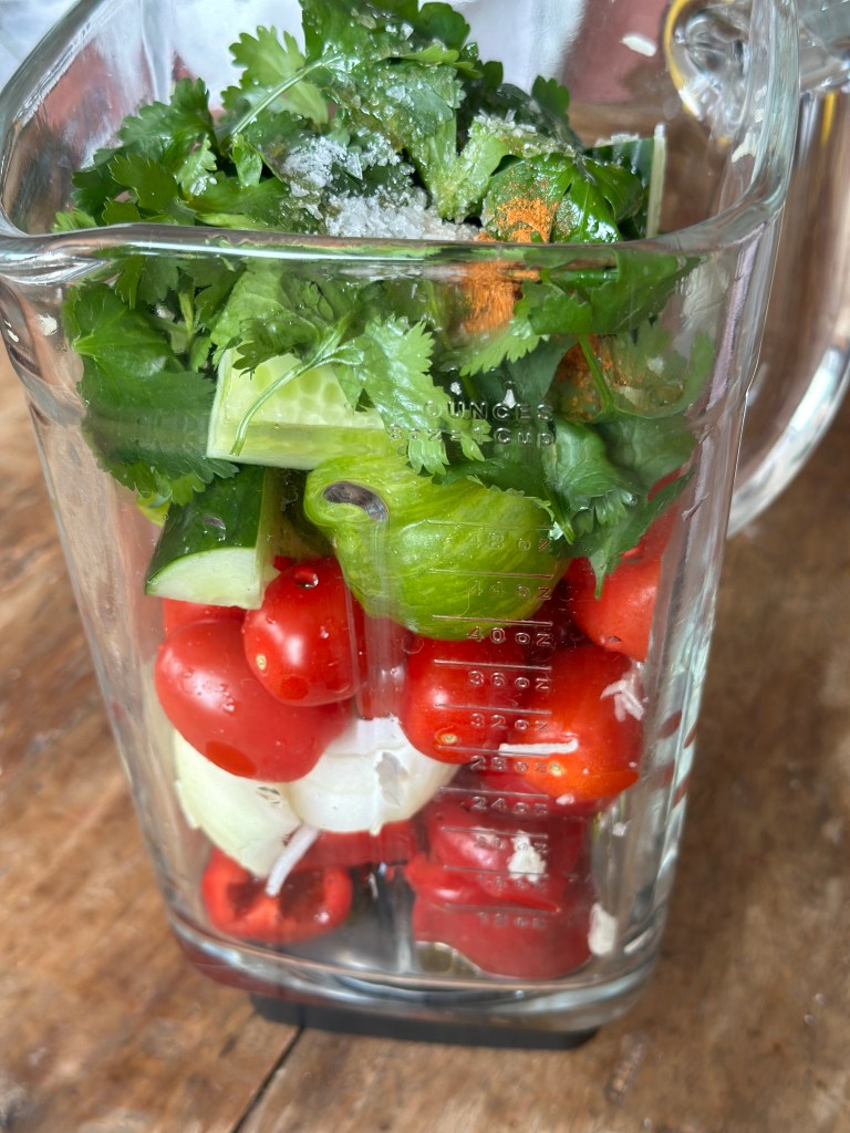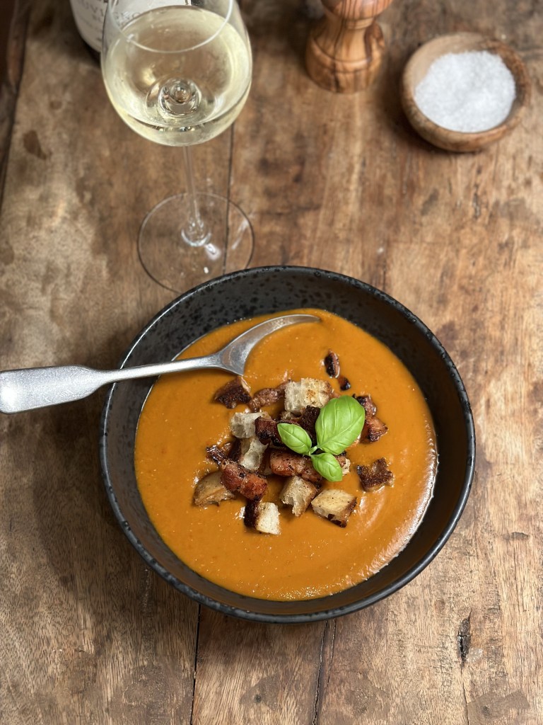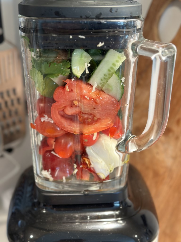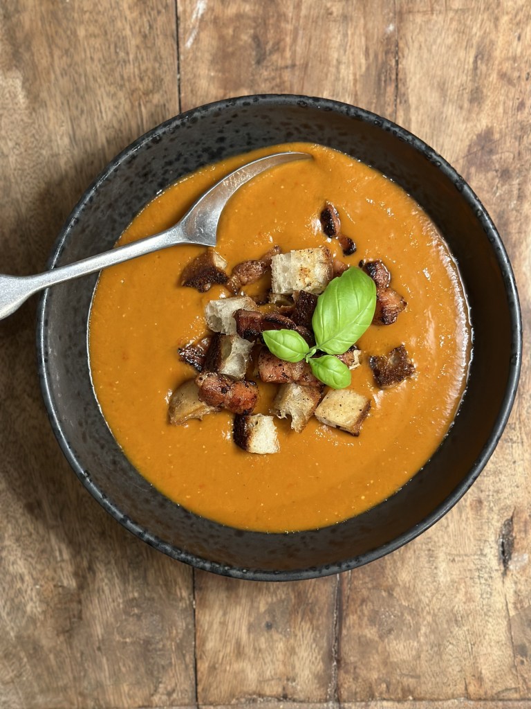 Denne spanske tomatsuppe er virkelig noget jeg kan lide. Den er forfriskende på en varm sommerdag, og du kan tilføje en masse forskellig topping. På billederne viser jeg coutoner og chilistegt bacon, men rejer fungerer godt, ligesom finthakket grøntsager.