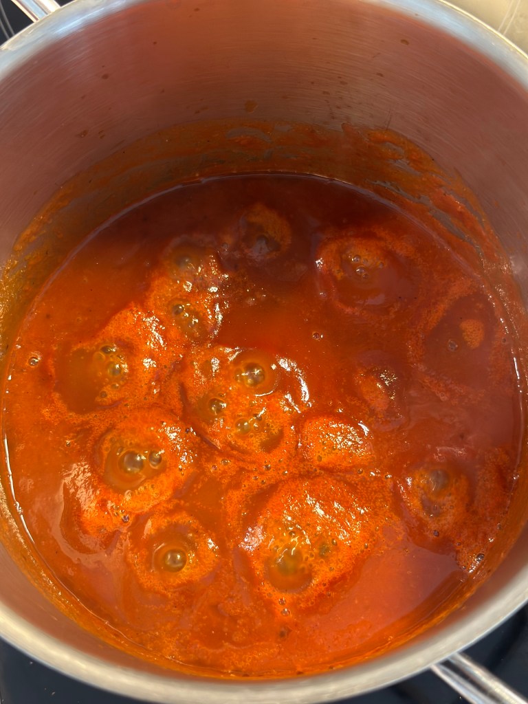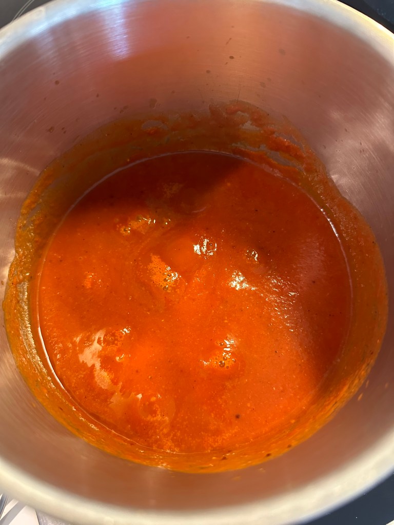 Jeg river hvidløg og palmesukkeret, men ellers kommer det hele i en blender. Herefter i en gryde, hvor det simrer i mindst en time, og gerne lidt mere.
