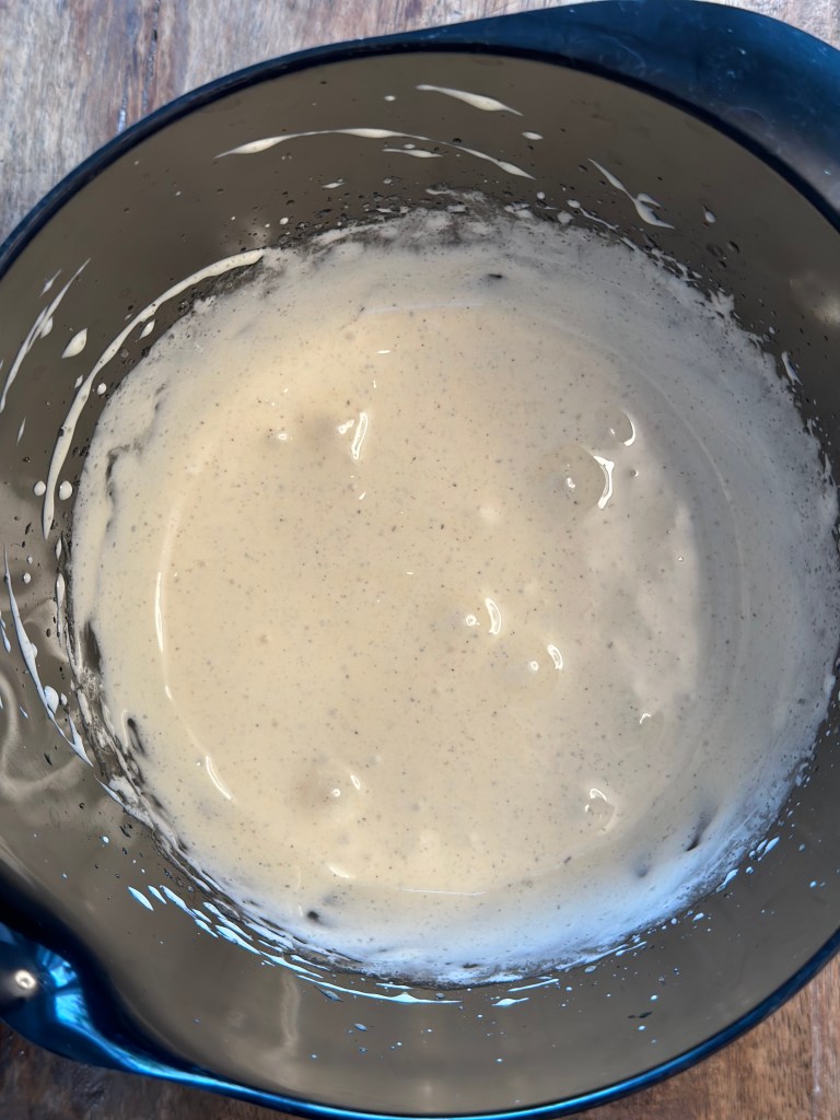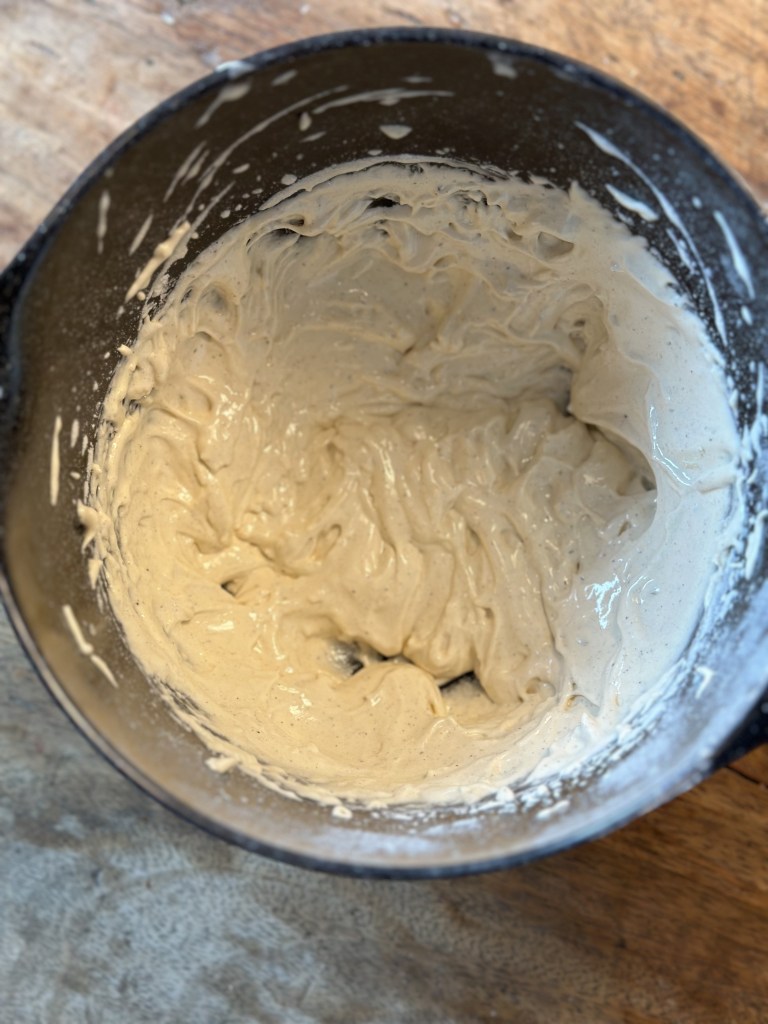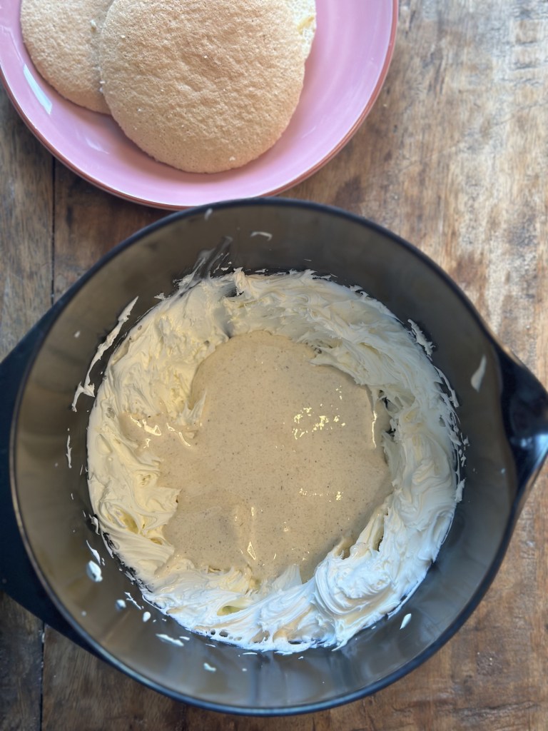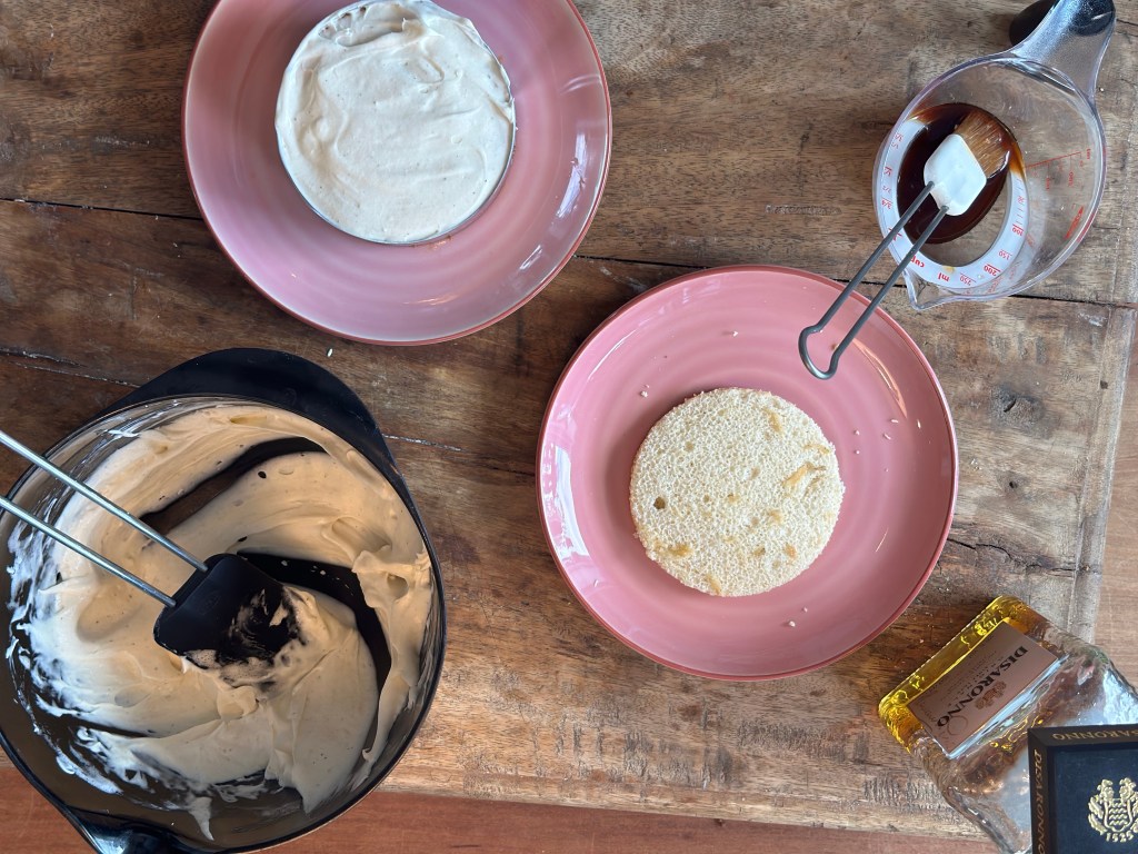 Jeg blander Amaretto og kaffen, og pensler til på Savoiadi.