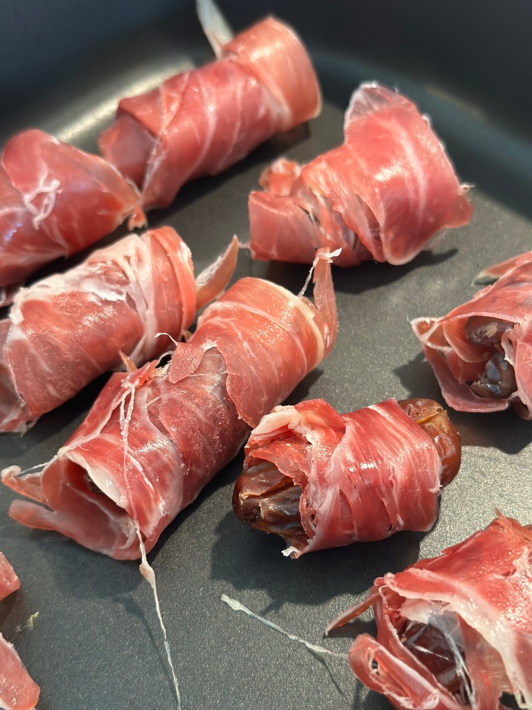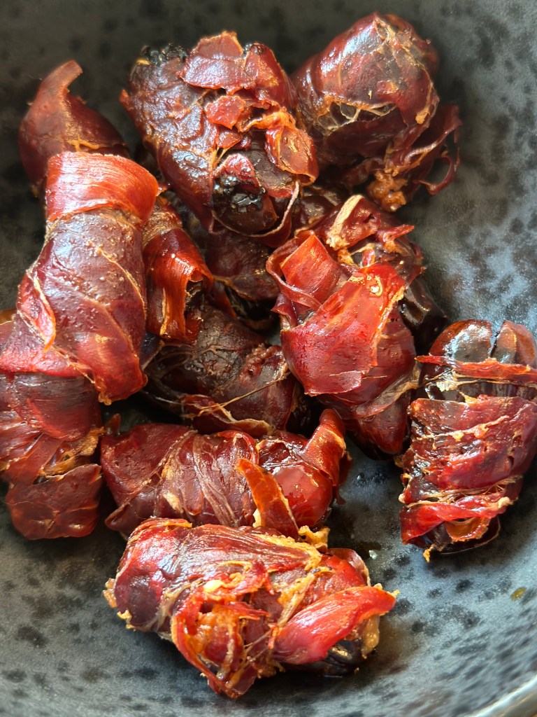 Denne snack fik jeg sammen med min søn på Mallorca for år tilbage. Det er en snack han gerne vil have, men han kan bedst lide den med bacon. Man kan tilføre ost, hvilket også gør den lækker, og krydre med chili. De skal blot i ovnen til du synes Serrano eller bacon er fint sprødt.