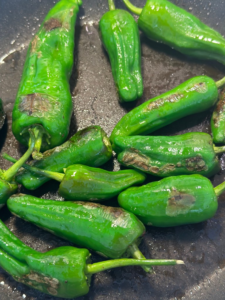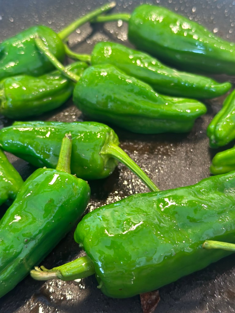 Padrón peberfrugte kommer oprindelig fra Sydamerika, men har fået deres navn efter byen Padrón i nordvest Spanien. De siges af fremme kærligheden, og de er så populære, at de har egen festival. Man kan tilberede dem både på en pande i olie eller i ovnen med olien. Når de er færdige, må de godt være lidt brændte, hvorfor jeg synes man styrer dem bedst på panden. Krydres kun med flagesalt.