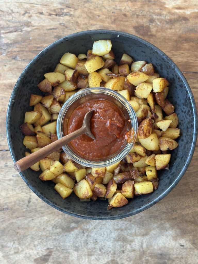 Dette ovnstegte eller friturestegte kartofler i tern, serveret med en stærk version af ketchup. Jeg bruger min barbeque sauce. Kartofler er en stor del af det spanske køkken, og denne snack er meget populær.
