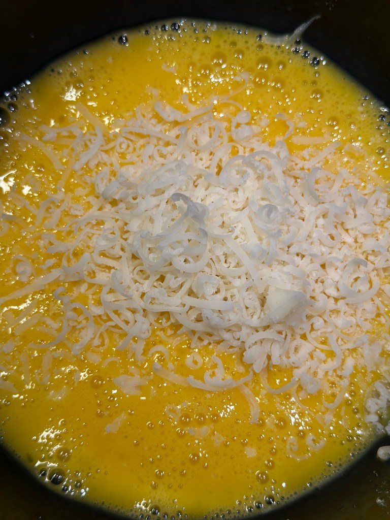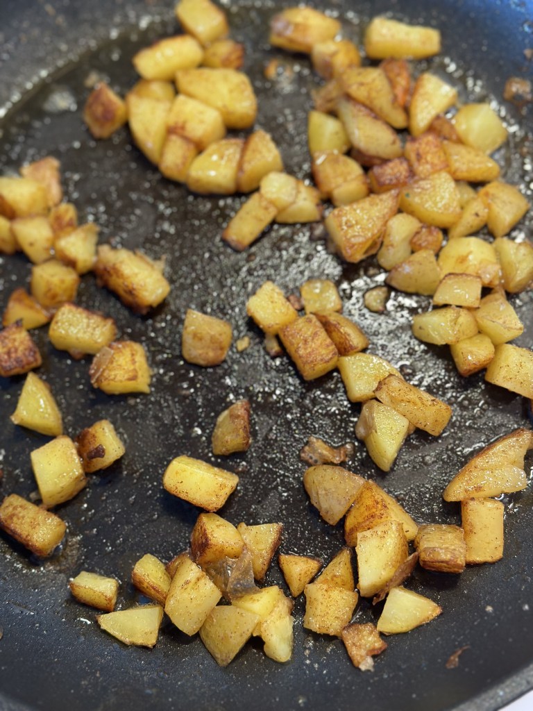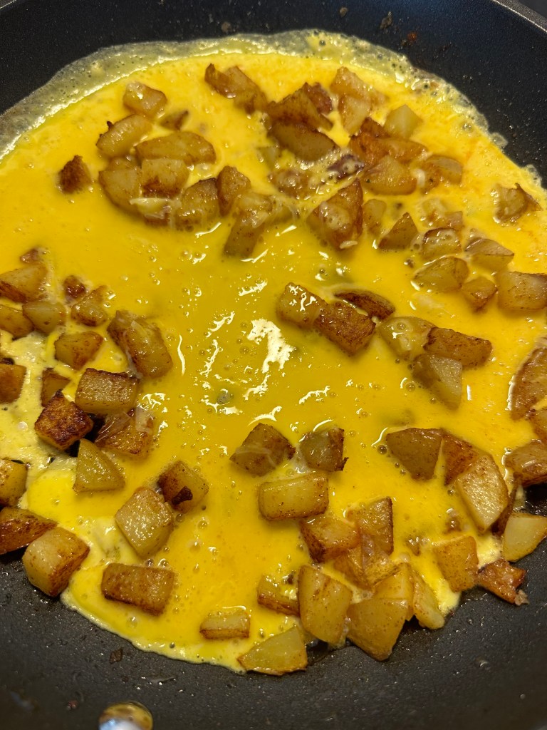 Skær kartoflerne i tern og steg på en pande i smør eller olie – krydret med paprika. Når de er sprøde på alle sider, tilsættes æggemassen nedenfor.