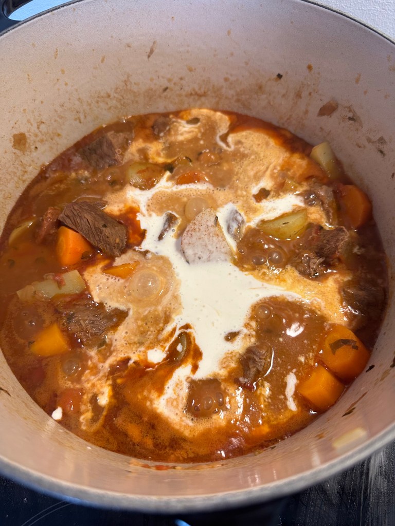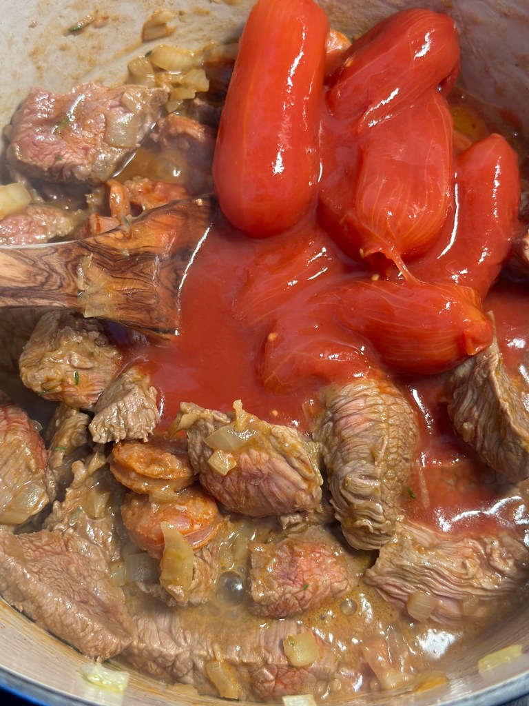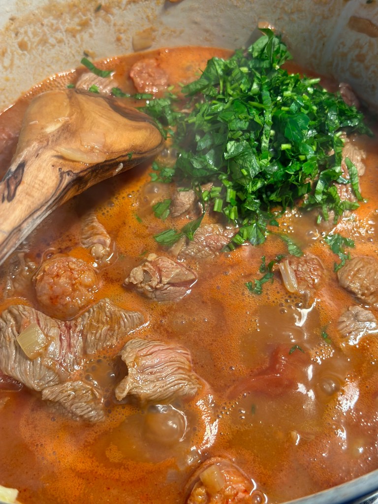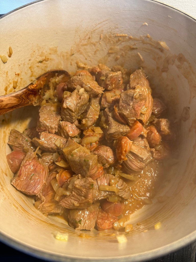 Varm gryden med olivenolie. Tilsæt hakket løg og revet hvidløg. De skal ikke tage farve. Tilsæt kødet og pølsen, og brun det sammen med paprika og chili. Tilsæt tomater og krydderurter. Lad det simre sammen. Pil timian og hak blad persillen – tilsæt. Og tilsæt Sherry og Sherry eddike. Det skal en del salt til, men jeg plejer at dosere over flere gange. Retten skal nu simre ved svag varme, og jeg synes gerne i 2 timer. Herefter tilsætter jeg gulerødder og kartofler – så jeg koger kartoflerne i retten. De skal simre videre i ca. 30-45 minutter. Først til sidst skaker jeg mel og fløde og jævner retten. Smag til igen med salt og peber – og hvis du ellers synes der mangler noget.