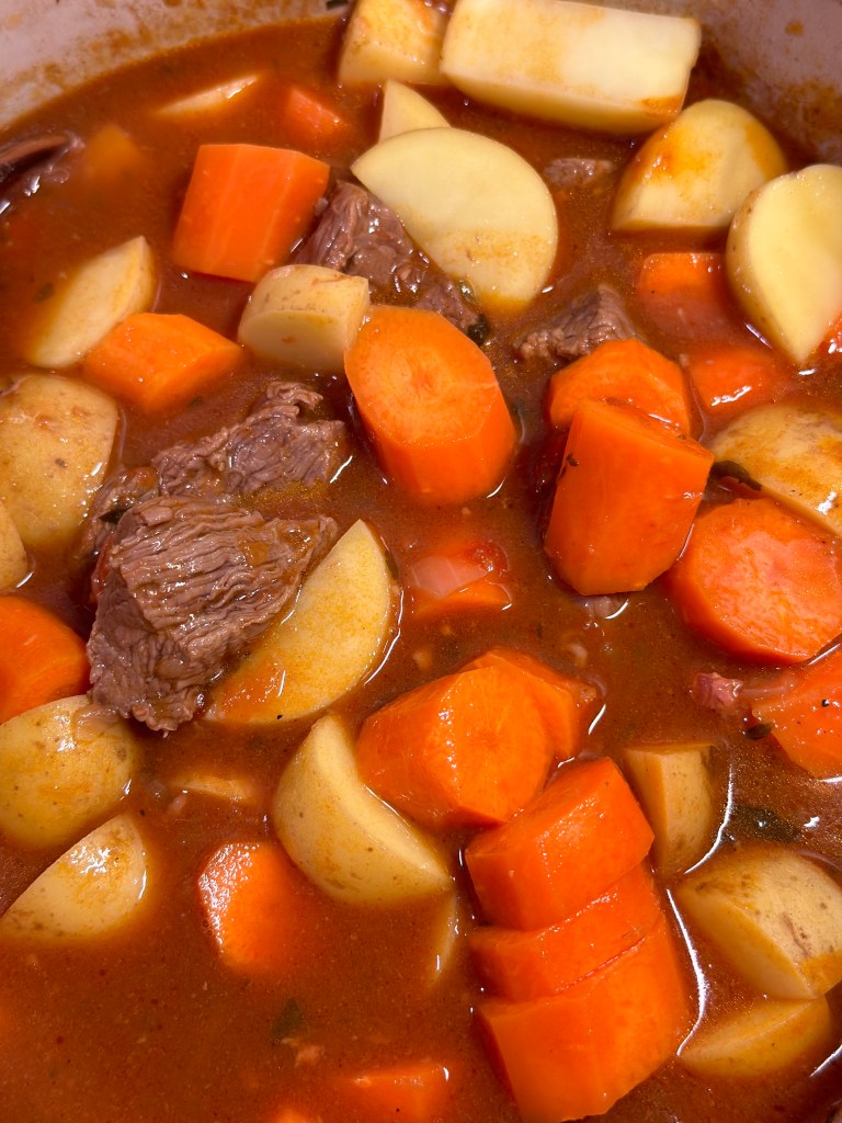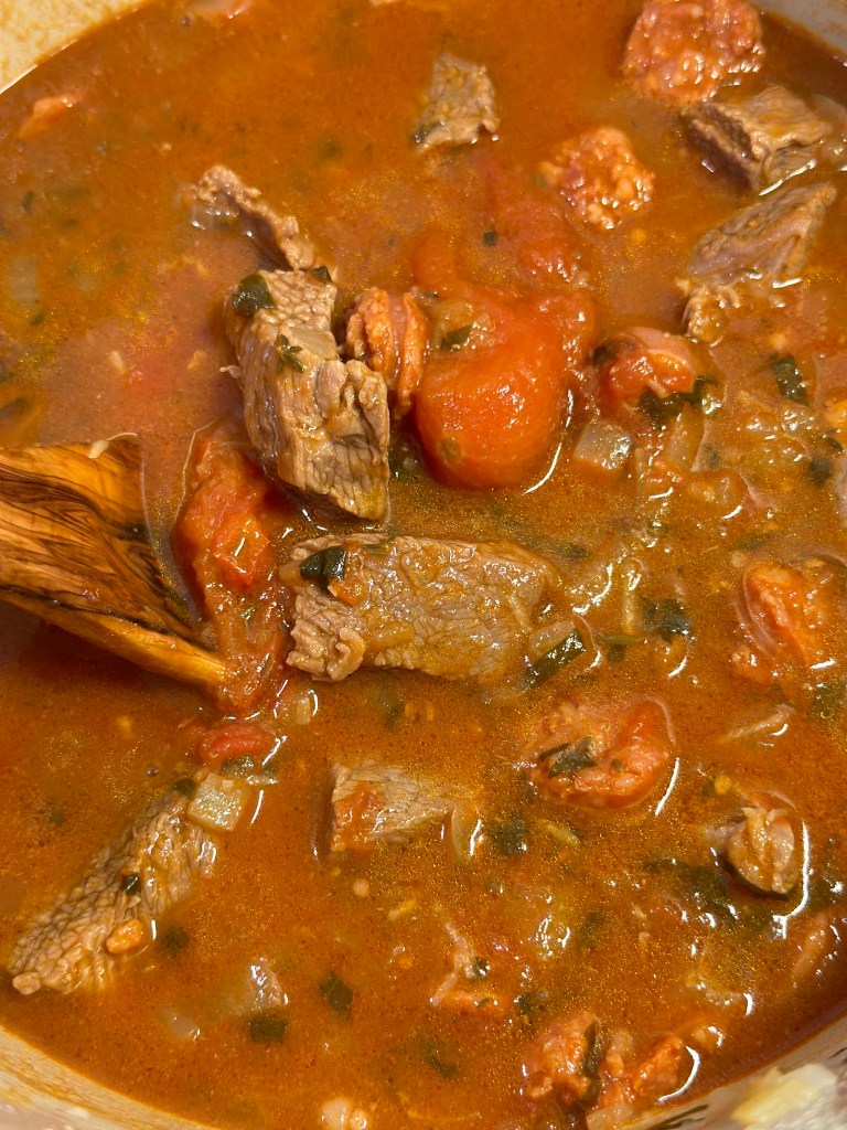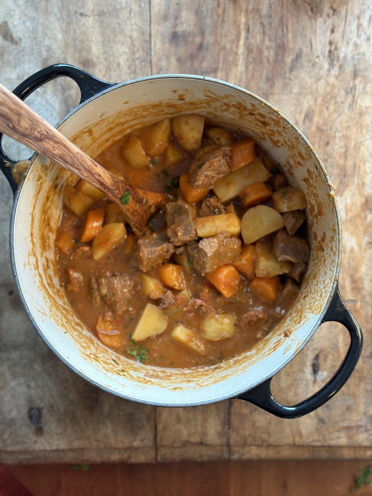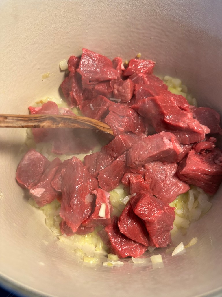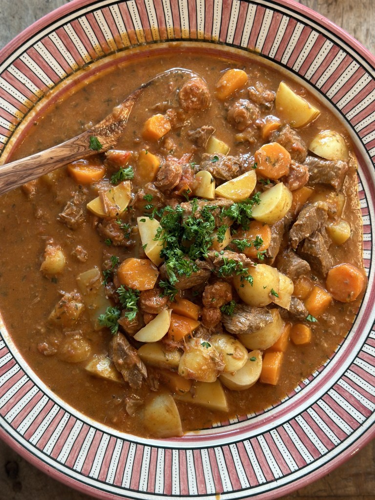 Varm gryden med olivenolie. Tilsæt hakket løg og revet hvidløg. De skal ikke tage farve. Tilsæt kødet og pølsen, og brun det sammen med paprika og chili. Tilsæt tomater og krydderurter. Lad det simre sammen. Pil timian og hak blad persillen – tilsæt. Og tilsæt Sherry og Sherry eddike. Det skal en del salt til, men jeg plejer at dosere over flere gange. Retten skal nu simre ved svag varme, og jeg synes gerne i 2 timer. Herefter tilsætter jeg gulerødder og kartofler – så jeg koger kartoflerne i retten. De skal simre videre i ca. 30-45 minutter. Først til sidst skaker jeg mel og fløde og jævner retten. Smag til igen med salt og peber – og hvis du ellers synes der mangler noget.