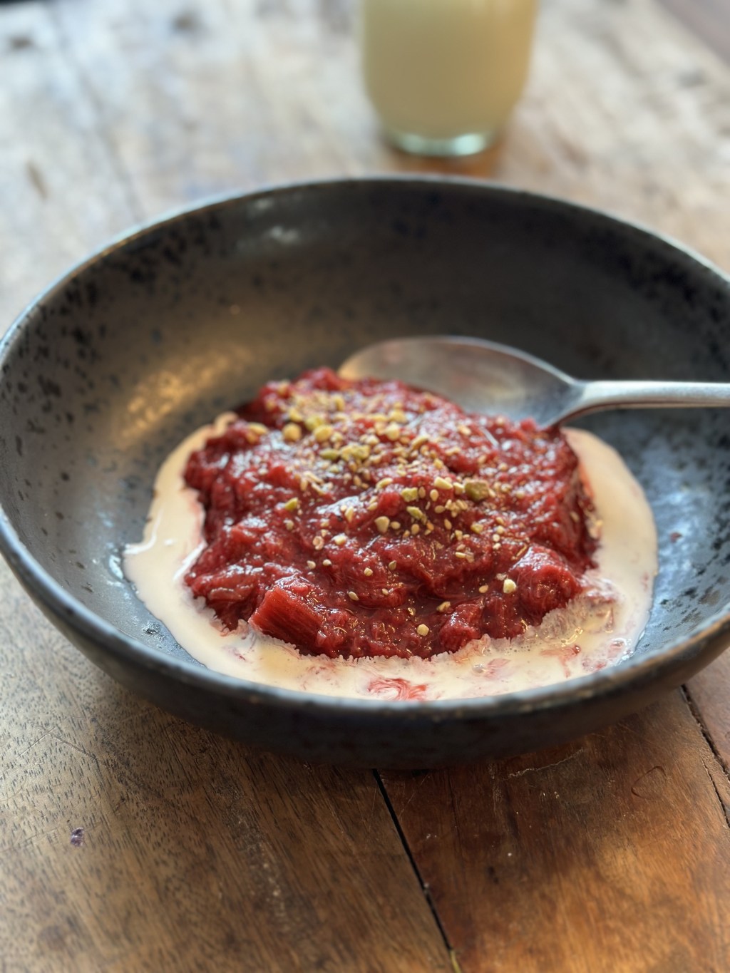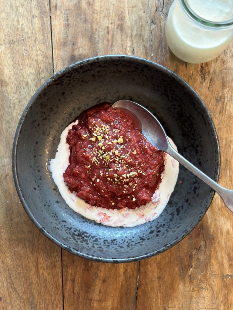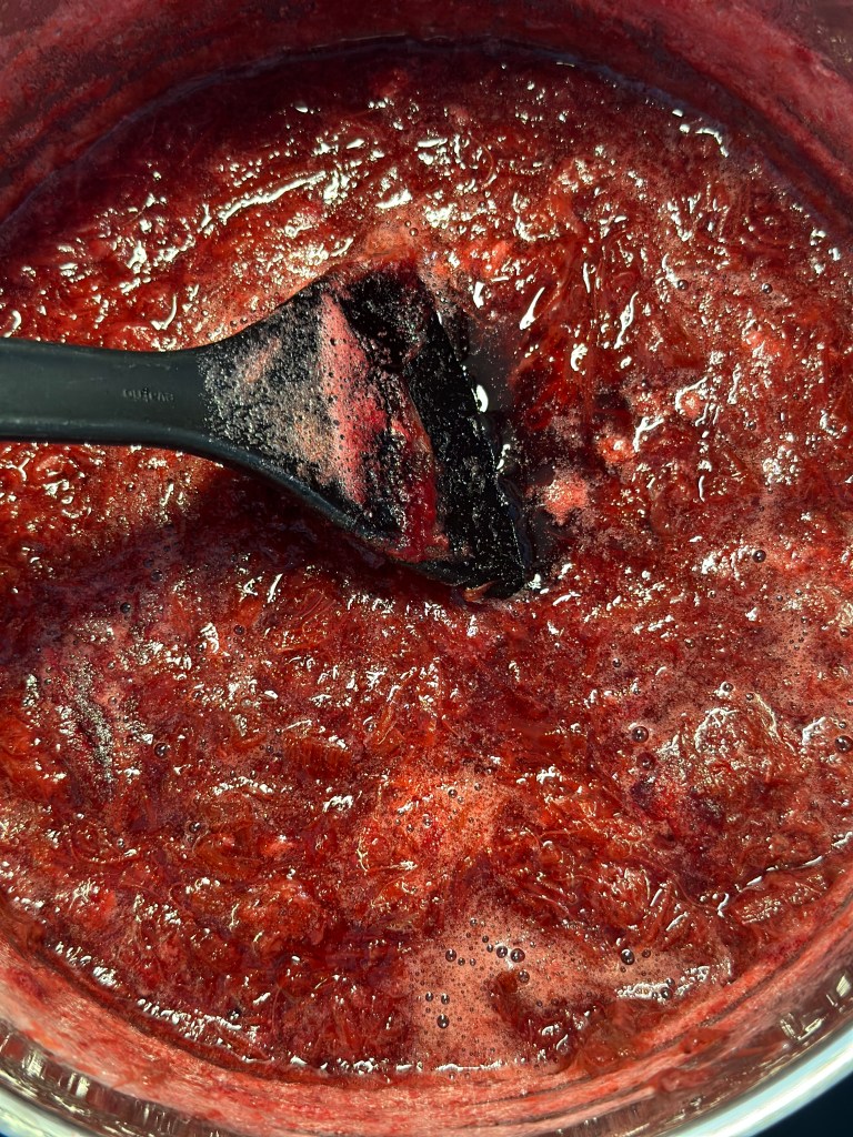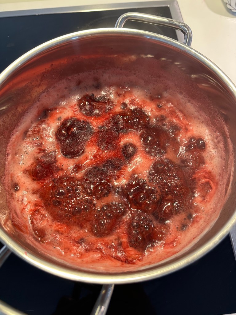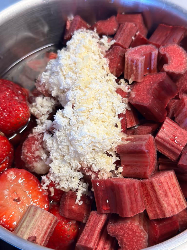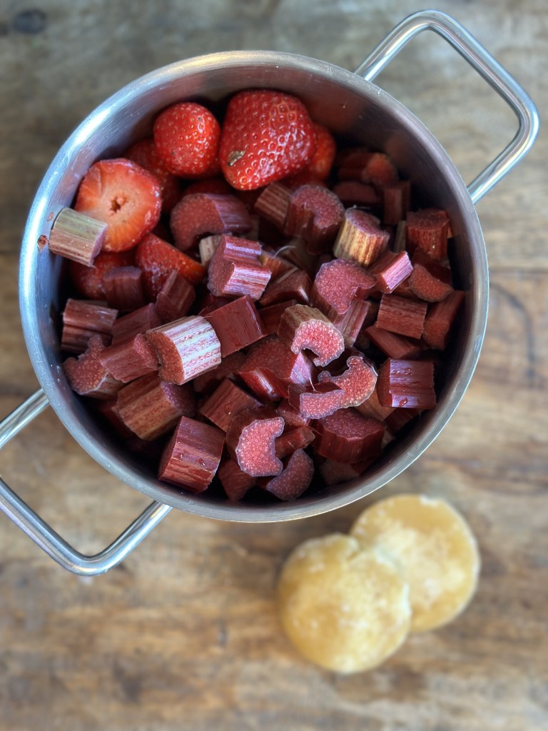 Jeg laver selv min i sæson, og nogen gange er det kun rabarber, andre gange sammen med jordbær – som i dag, hvor den er med 2/3 jordbær. Dækket med vand og 2 stykker palmesukker – smag til med rørsukker efter smag og behag – og hvor sure rabarberne er. Palmesukker, fordi det smager bedre. Bringes i løg og simrer – ja, jeg synes godt i 30-40 minutter.