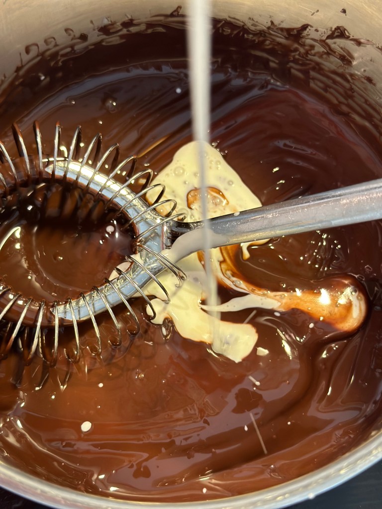 Smelt chokoladen og smøret ved svag varme. Tilsæt piskefløden, under samme varme – brug et fladt piskeris.