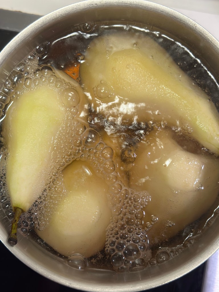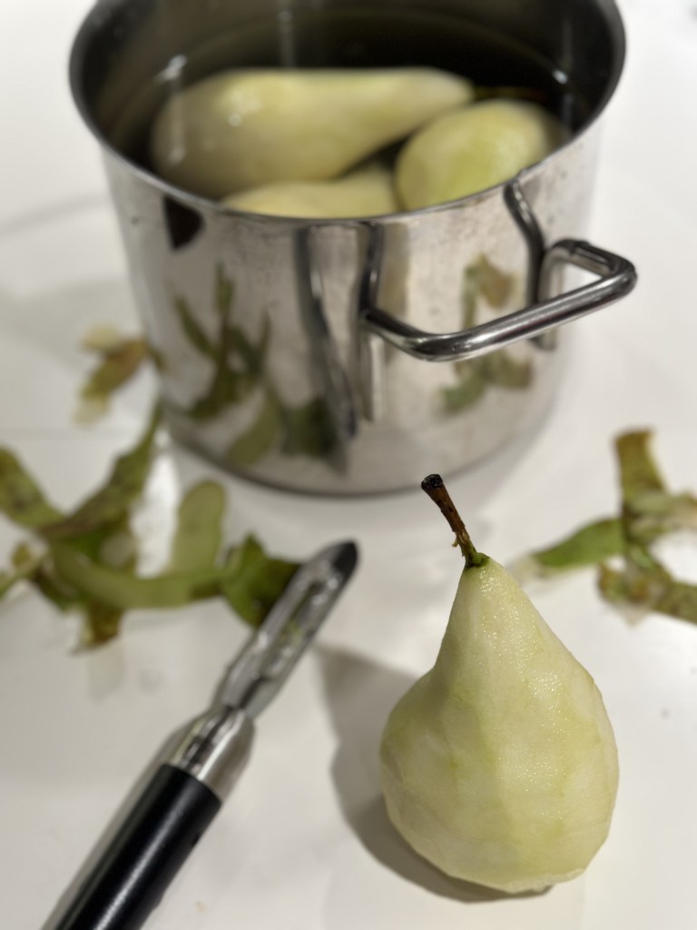 Jeg skralder 4 pærer og fjerner kernehuset med skralderen. Koger dem i 45 minutter i vand, cognac, og 1 dl rørsukker. Prik med en kartoffelgaffel om de er møre.