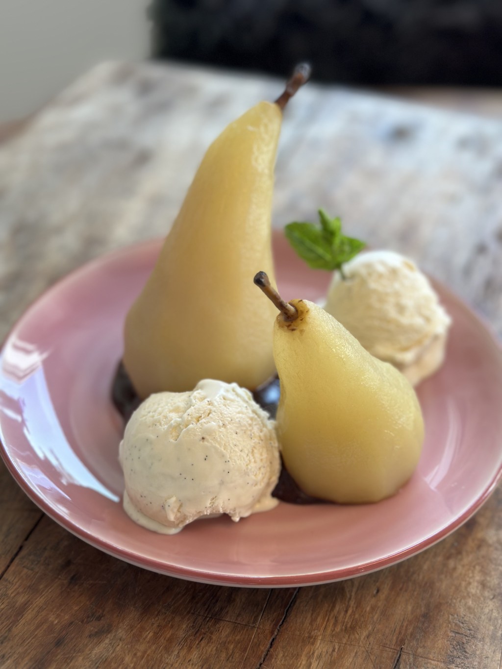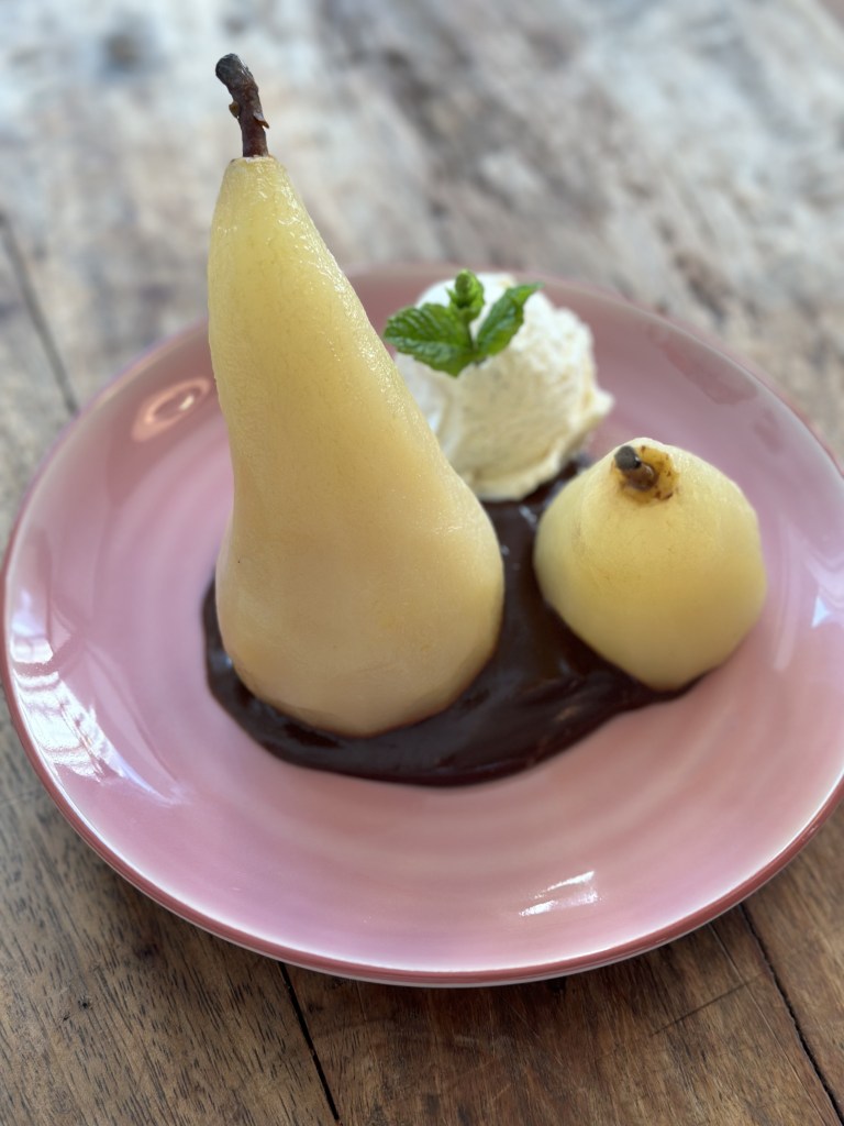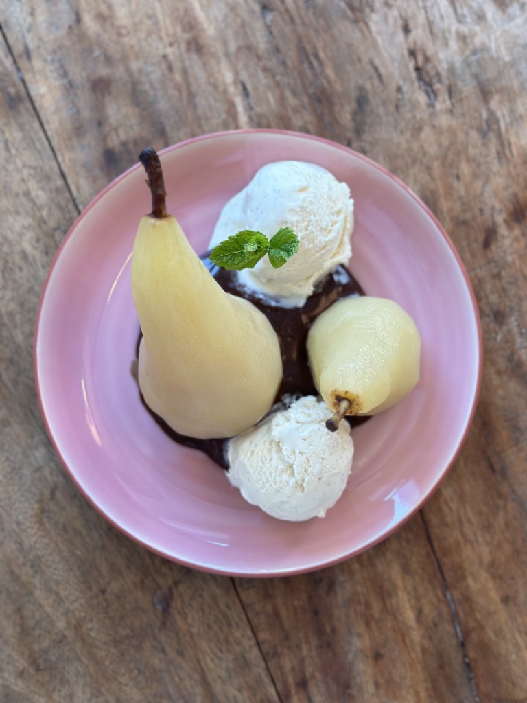 En klassisk dessert med henkogte pærer, chokolade sauce og en god vaniljeis. På dansk “Pære belle Helene”