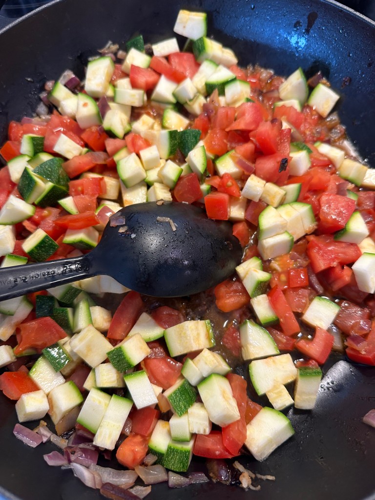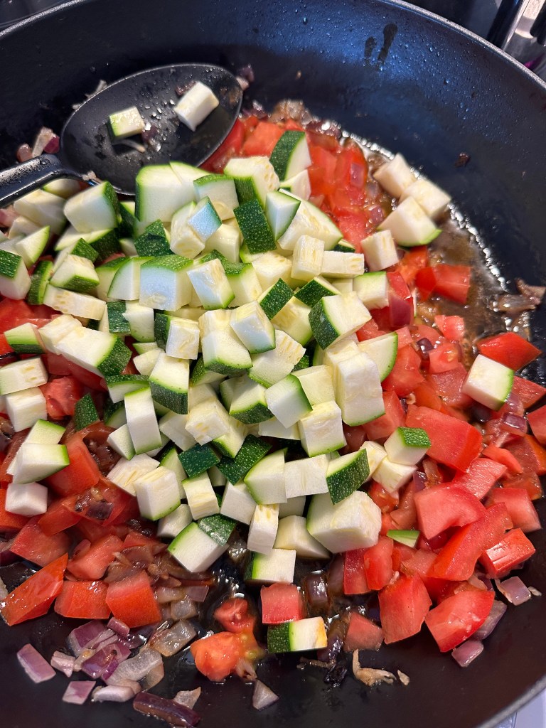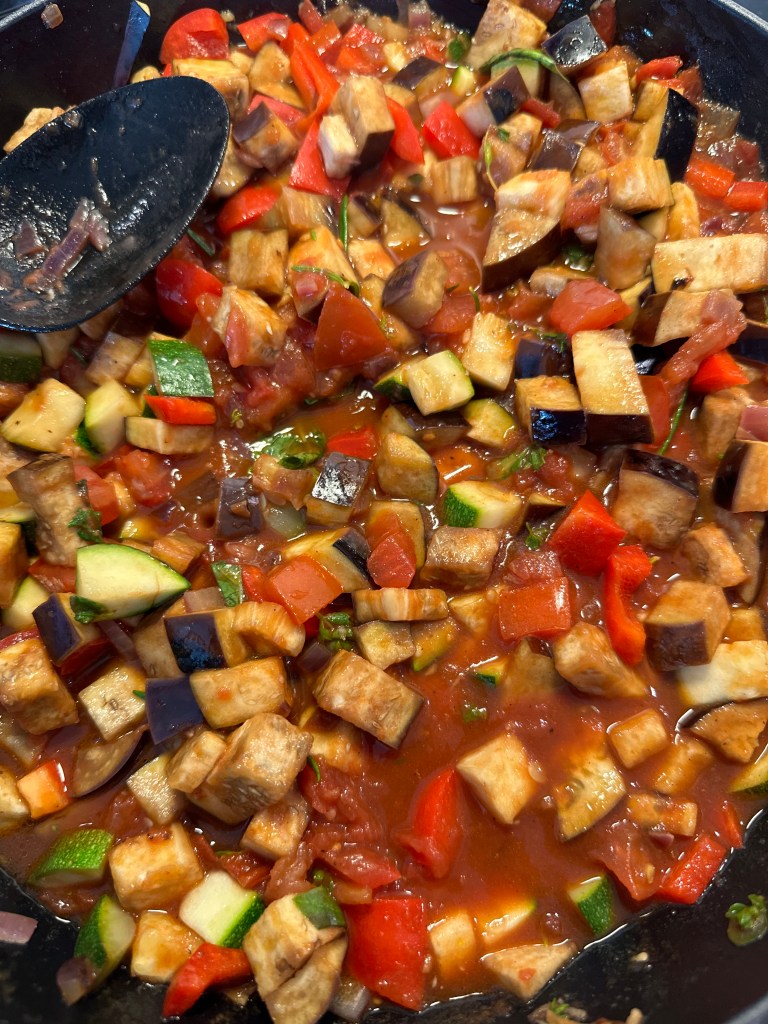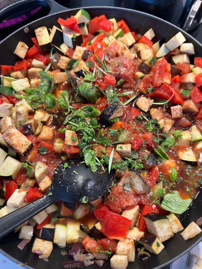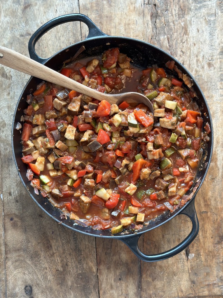 Start med at sautere hakket løg og revet hvidløg – skal blot “klares”. Tilsæt friske tomater. Tilsæt Squash, rød peberfrugt og Aubergine – og herefter en dåse tomater. Tilsæt rødvin og krydderurterne uden stilk. Tilsæt de sidste krydderier og smag til med salt og peber. Sauter det hele løbende i takt med flere og flere ingredienser kommer i retten. Lad det hele simre 20 minutter til sidst, så der bevares en smule bid.