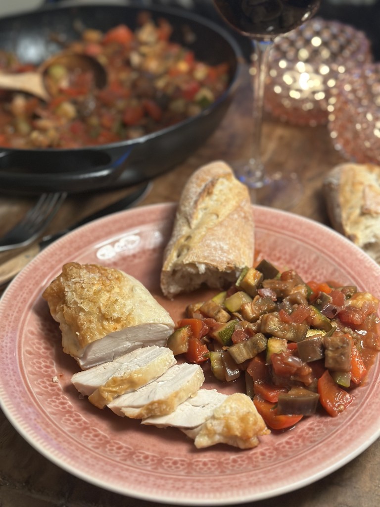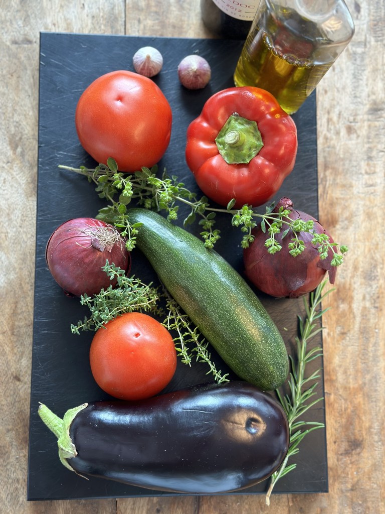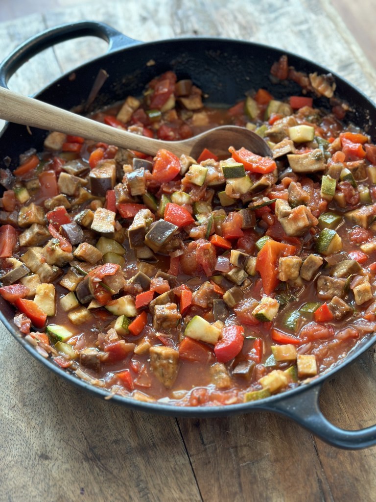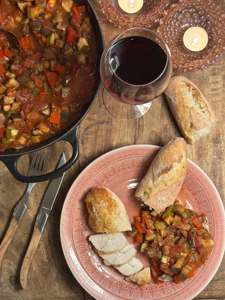 “Rata” er den franske betegnelse på “feltration” – altså en afmålt størrelse til soldaterne. “Touille” betyder sammenrørt, og tilsammen har du en skøn grøntsagsret som kan spises alene, med et stykke brød – eller perfekt som tilbehør fx. til mad på grillen. Den er god hele året.