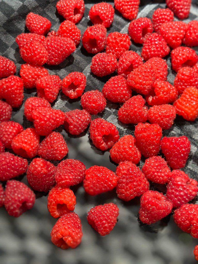 Kagen skal være helt kold. Et passende lag ribs gele fordeles i bunden af tærten. Hindbær monteres pænt derefter. Jeg bruger i dag hindbær-sorten Vajolet som er et sødt og mildt bær – og super smukt.