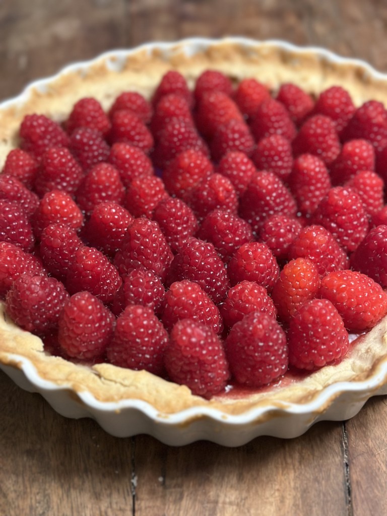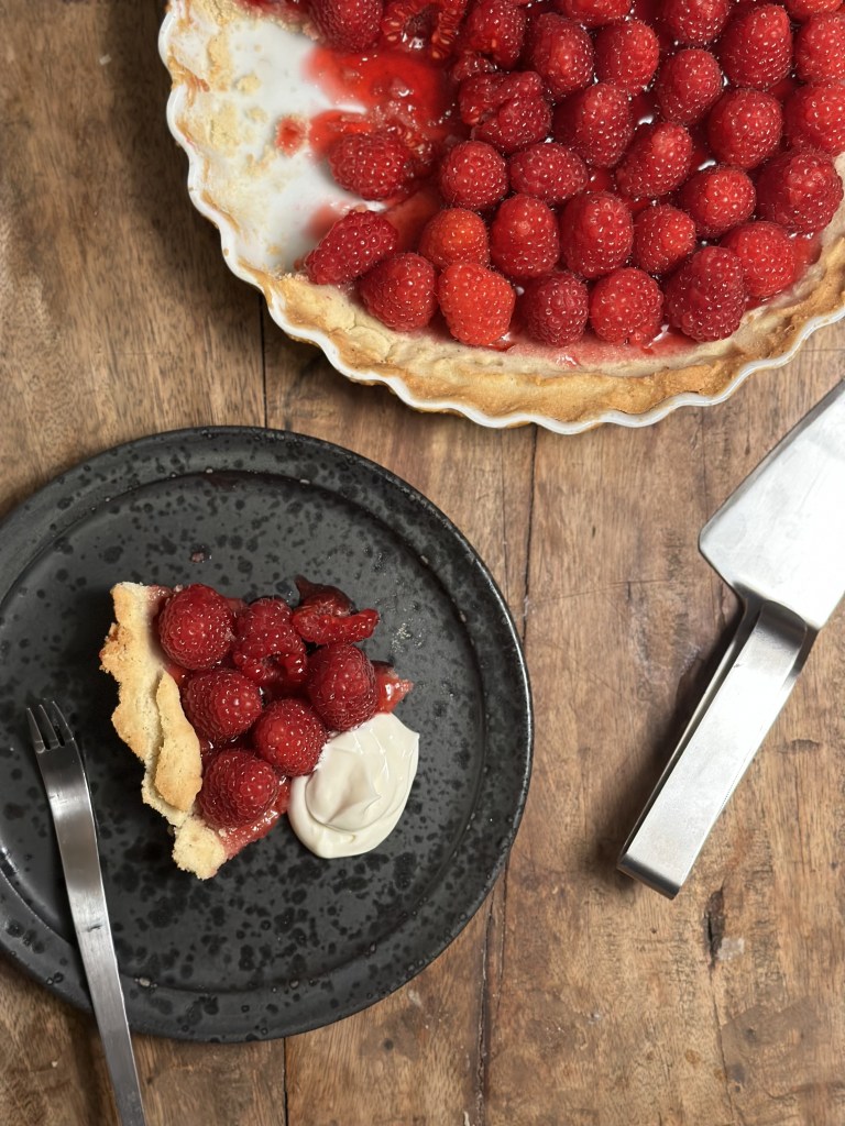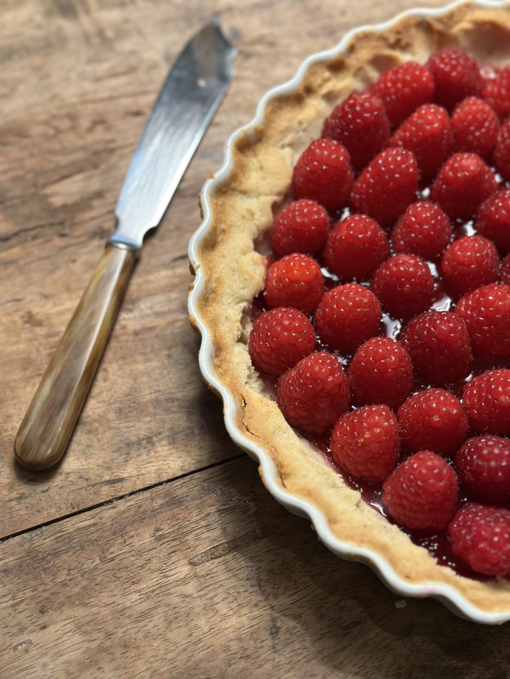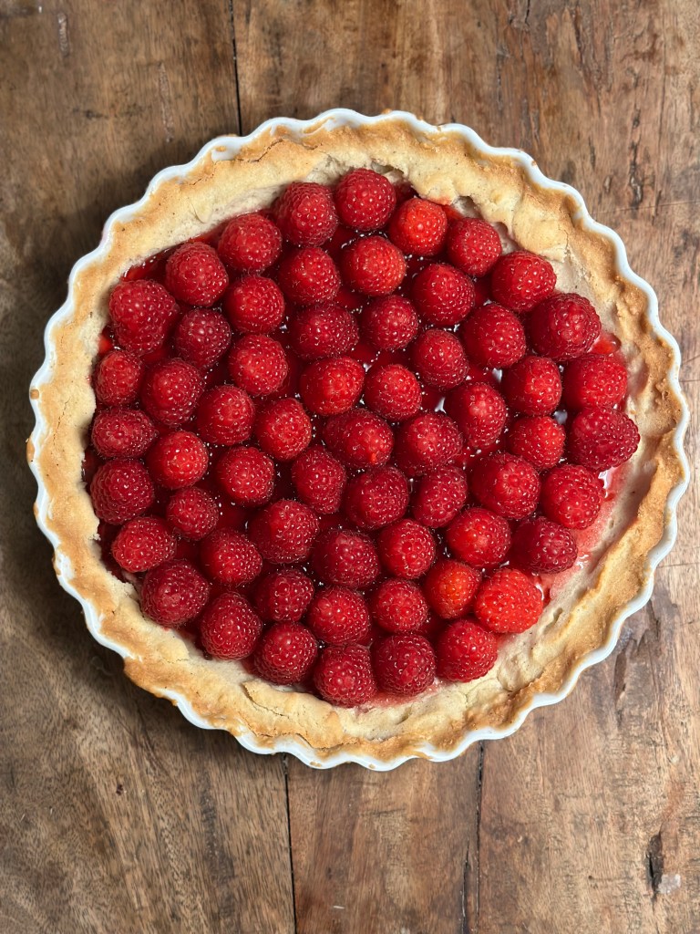 I Frankrig er det traditionel kage tærte, som alle bagere har i disken. Man mener den stammer fra Loiredalen et i 1800 tallet. Den findes i forskellige versioner – både med og uden creme. I dag laver jeg med Hindbær sorten Vajolet som er et sødt og mildt bær – og super smukt.