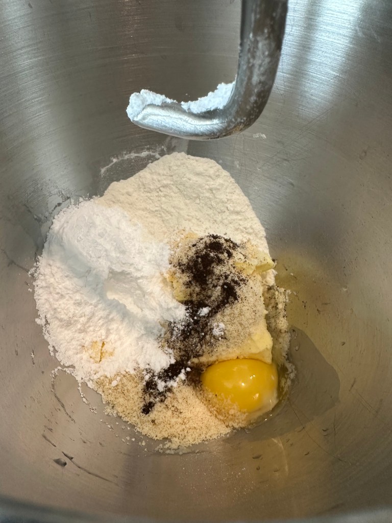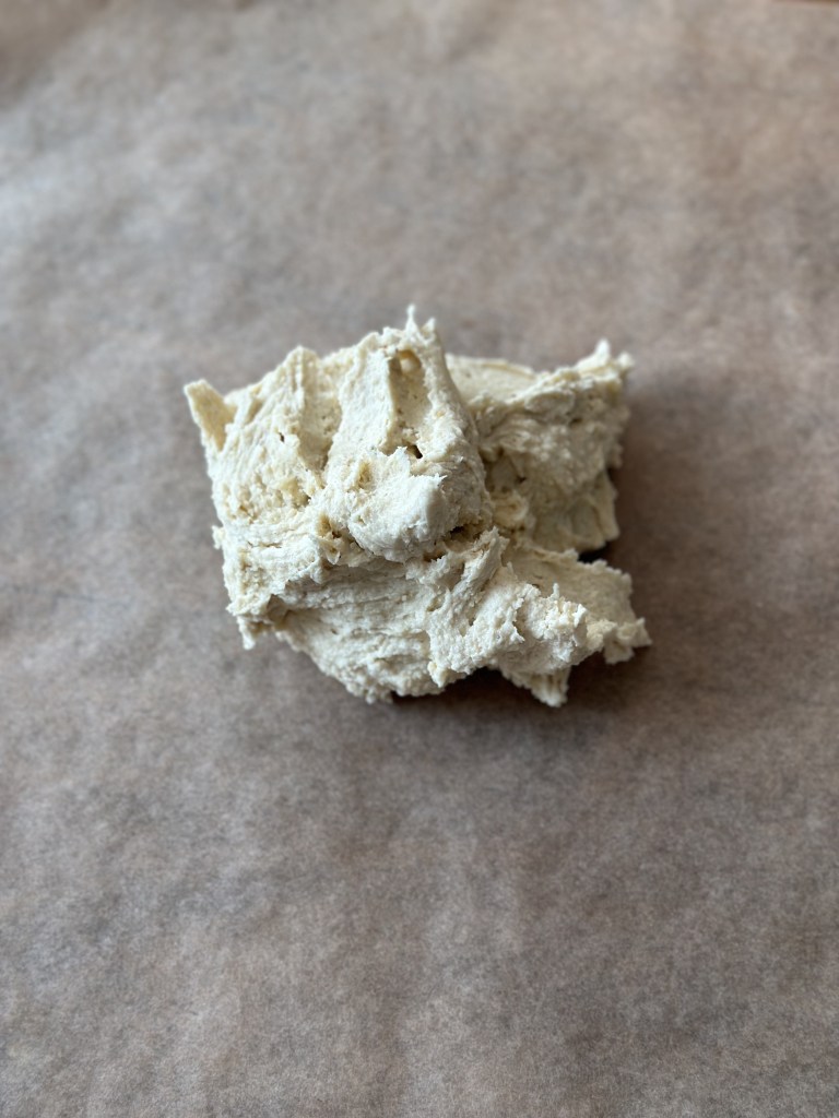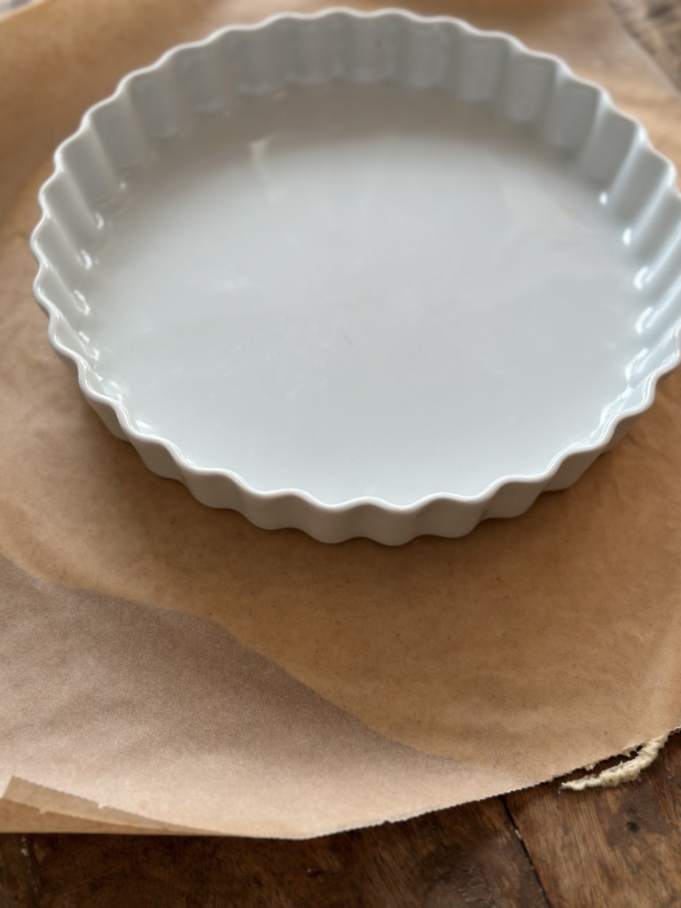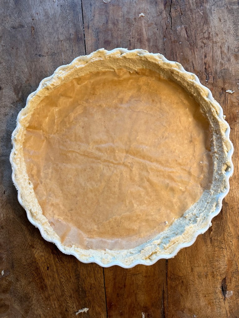 Alle ingredienser undtagen 100 gram hvedemel, hældes i en skål i og røres godt sammen – gerne med en røremaskine. Når dejen er samlet, tilsættes den resterende mængde mel. Dejen er relativ knæ, med det gør den blot nemmere at rulle ud imellem 2 stykker bagepapir i en størrelse som passer med din form. Lægges på køl i en times tid. Dejen placeres i en smurt form, og der skæres et stykke bage papir som kan være i tærteformen, hvorpå der lægges tørrede kikærter. Herefter 170 grader i 20 min (ikke varmluft)