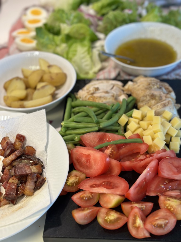 Herudover er tomater obligstorisk – det kan være både bøf, cherry, soltørrede eller andre klassiske. Rødløg, kartofler, agurk, fast ost af forskellig slags (typisk Comté) samt æg. Nogen gange grønne bønner.