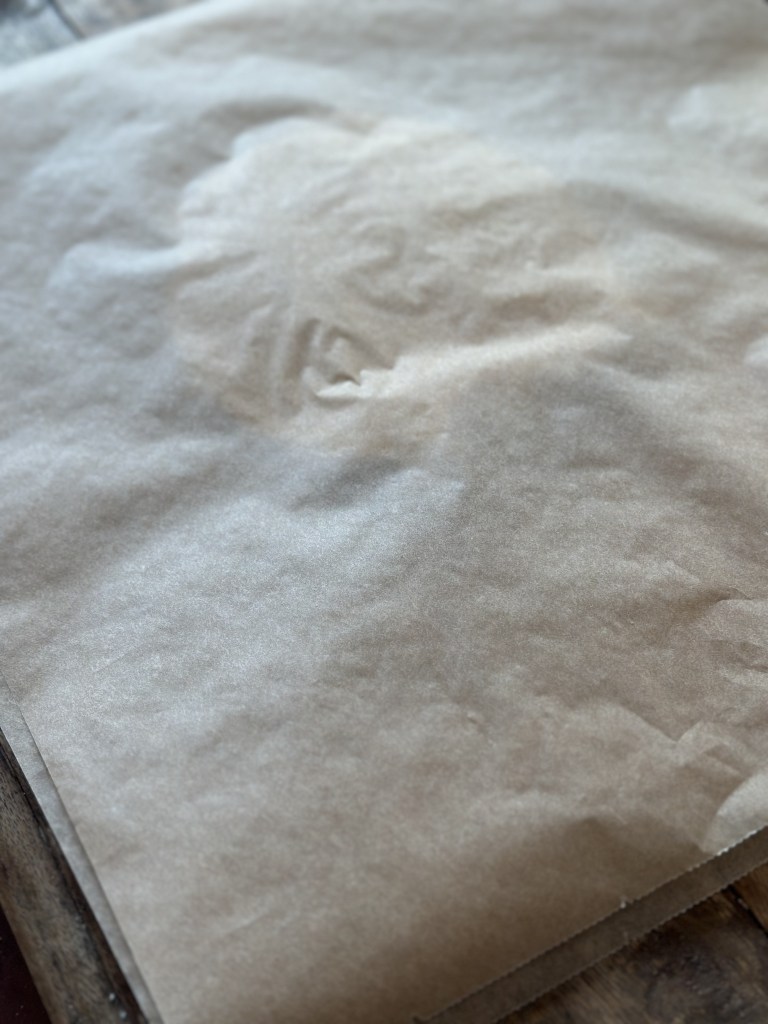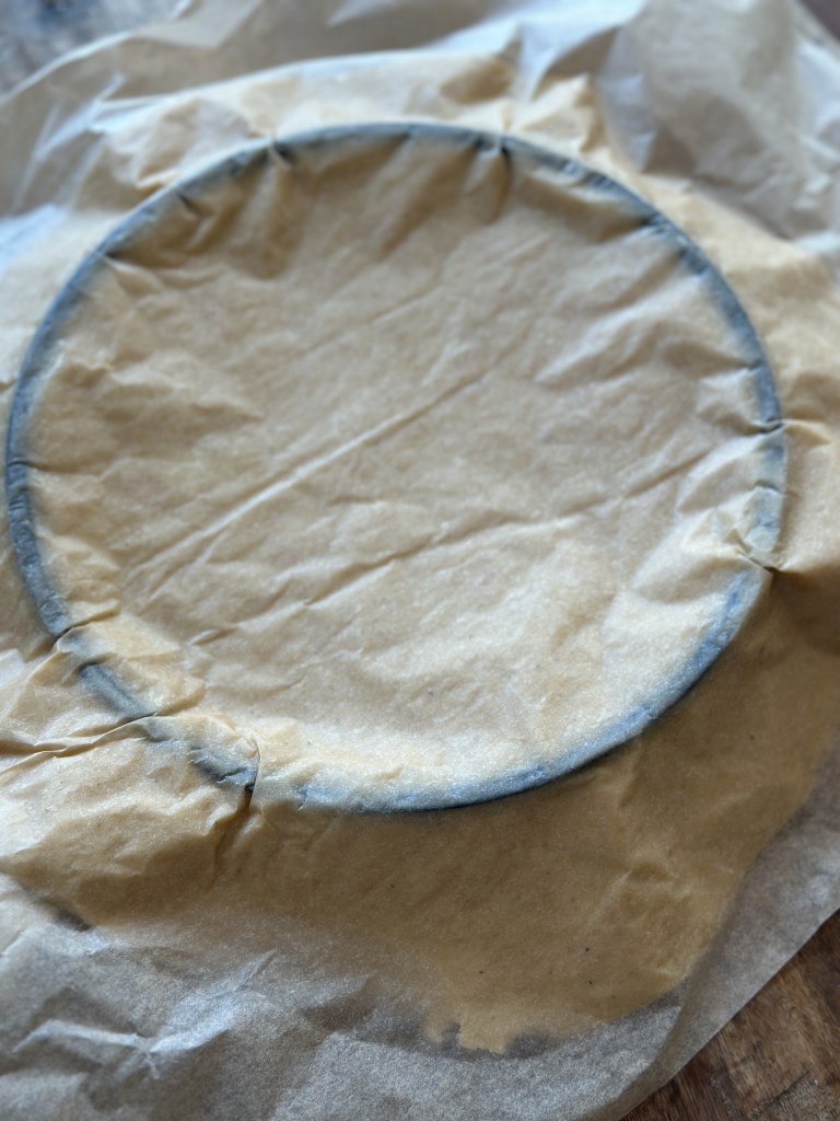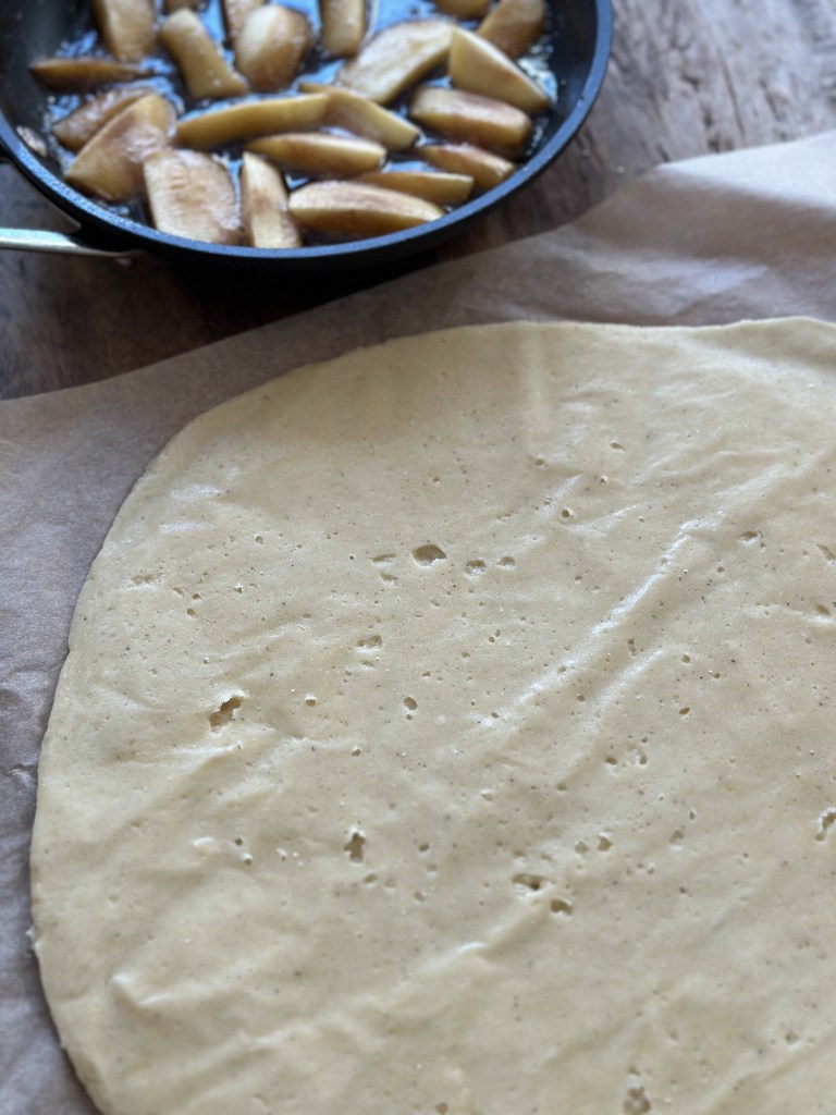 Æble-karamellen skal lige køle lidt, og være “fusioneret”. Fjern det ene bagepapir fra dejen og læg låg på panden – med det andet bagepapir øverst. Pres ned på kanten – panden rundt, Fjern det sidste bagepapir – det skal gøres forsigtigt for dejen sidder lidt fast.