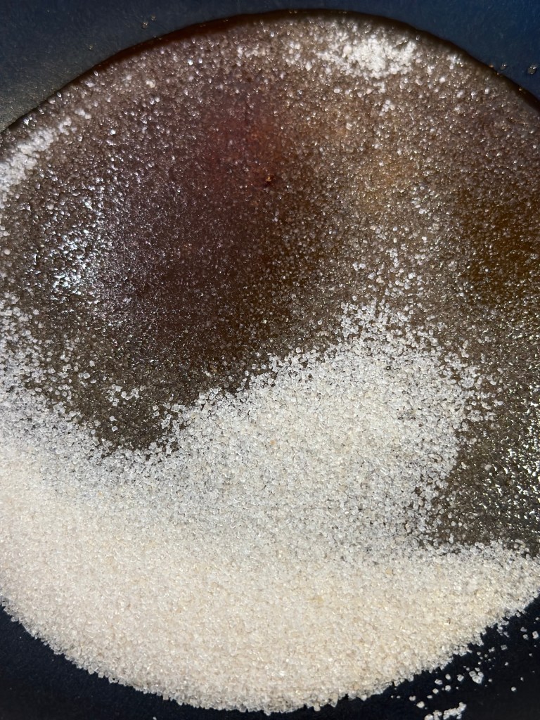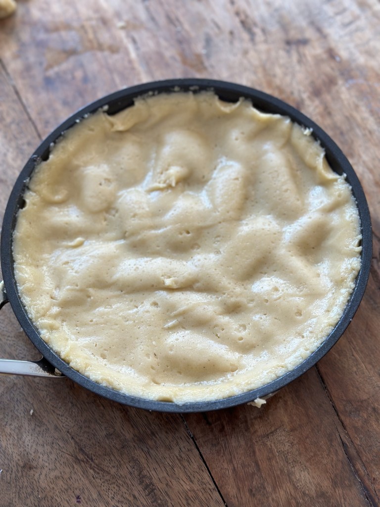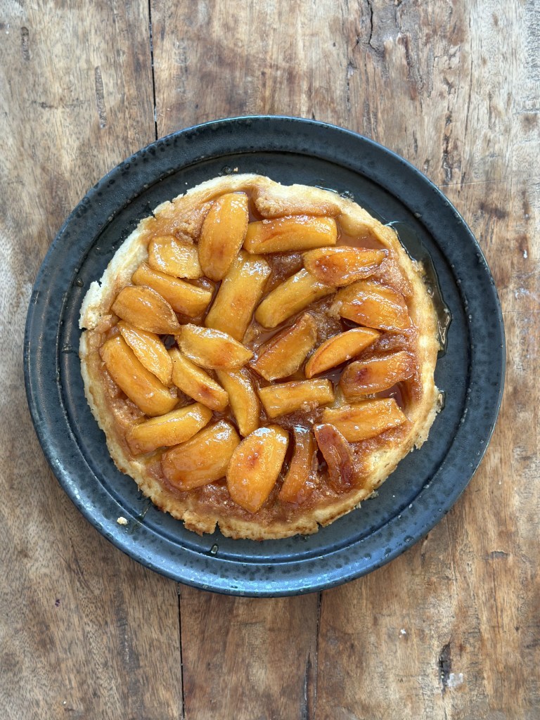 Når den kommer ud, lægges et fad eller tallerken med toppen mod dejen, og vender hele tærten over på (flippes hurtigt, men forsigtigt).
